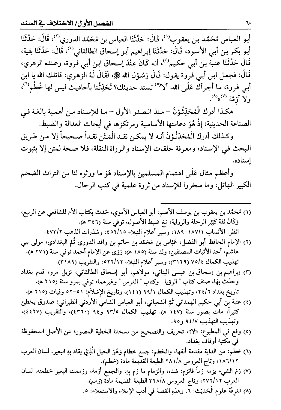 هكذا أدرك الْمُحَدِّثُوْنَ - منذ الصدر الأول - ما للإسناد من أهمية بالغة في الصناعة الحديثية؛ إِذْ هُوَ دعامتها الأساسية ومرتكزها في أبحاث العدالة والضبط.