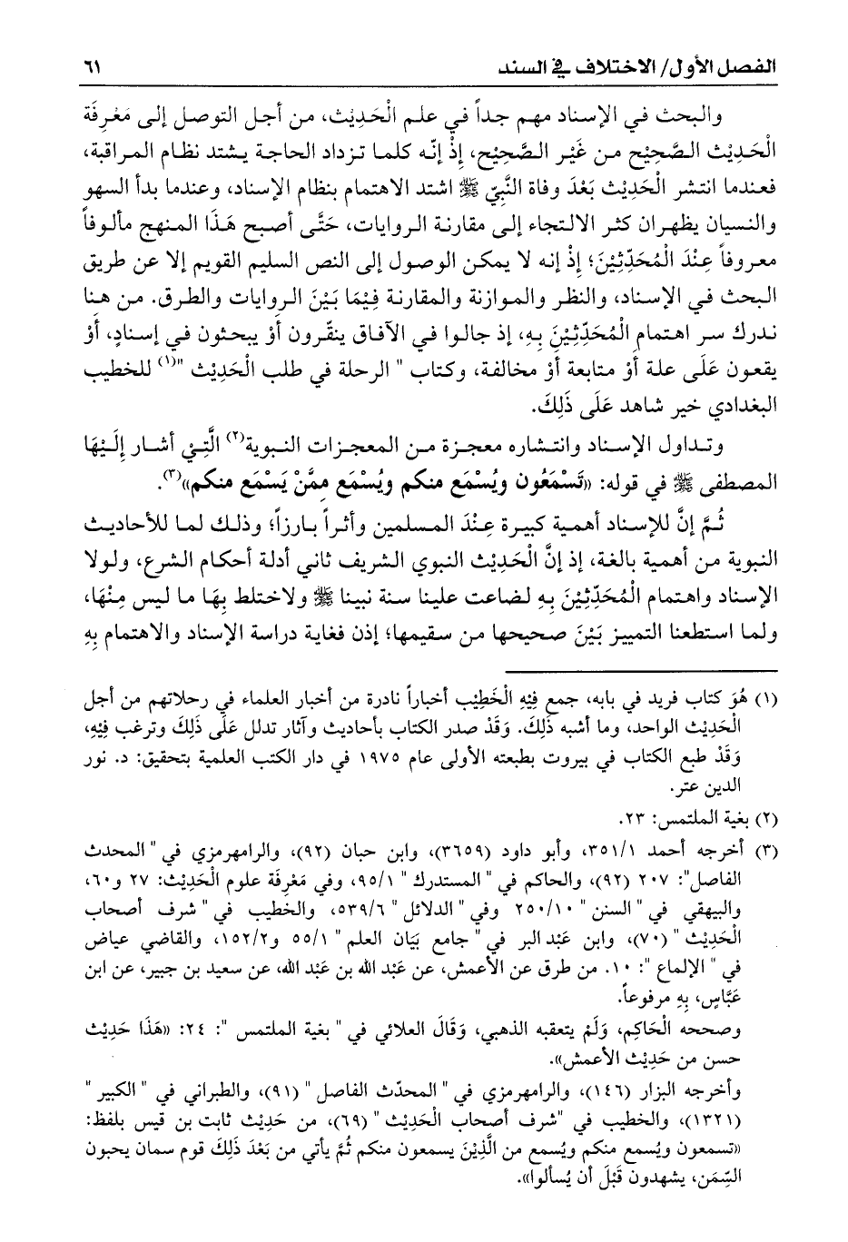 والبحث في الإسناد مهم جداً في علم الْحَدِيْث، من أجل التوصل إلى مَعْرِفَة الْحَدِيْث الصَّحِيْح من غَيْر الصَّحِيْح، إِذْ إنّه كلما تزداد الحاجة يشتد نظام المراقبة، فعندما انتشر الْحَدِيْث بَعْدَ وفاة النَّبِيّ - صلى الله عليه وسلم - اشتد الاهتمام بنظام الإسناد، وعندما بدأ السهو والنسيان يظهران كثر الالتجاء إلى مقارنة الروايات، حَتَّى أصبح هَذَا المنهج مألوفاً معروفاً عِنْدَ الْمُحَدِّثِيْنَ؛ إِذْ إنه لا يمكن الوصول إلى النص السليم القويم إلا عن طريق البحث في الإسناد، والنظر والموازنة والمقارنة فِيْمَا بَيْنَ الروايات والطرق. من هنا ندرك سر اهتمام الْمُحَدِّثِيْنَ بِهِ، إذ جالوا في الآفاق ينقّرون أَوْ يبحثون في إسنادٍ، أَوْ يقعون عَلَى علة أَوْ متابعة أَوْ مخالفة، وكتاب "الرحلة في طلب الْحَدِيْث" (¬1) للخطيب البغدادي خير شاهد عَلَى ذَلِكَ.