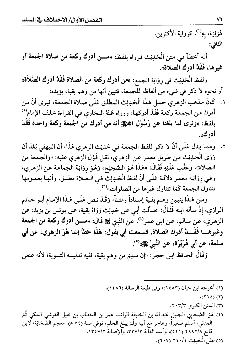 ومن هَذَا يتبين وهم بقية إسناداً ومتناً، وَقَدْ نص عَلَى هَذَا الإمام أبو حاتم الرازي، إِذْ سأله ابنه فَقَالَ: ((سألت أبي عن حَدِيْث رَوَاهُ بقية، عن يونس بن يزيد، عن الزهري، عن سالم، عن ابن عمر (¬4)، عن النَّبِيّ - صلى الله عليه وسلم - قَالَ: ((من أدرك ركعة من الجمعة وغيرها فَقَدْ أدرك الصلاة. فسمعت أبي يقول: هَذَا خطأ إنما هُوَ الزهري، عن أبي سلمة، عن أبي هُرَيْرَة، عن النَّبِيّ - صلى الله عليه وسلم -)) (¬5).