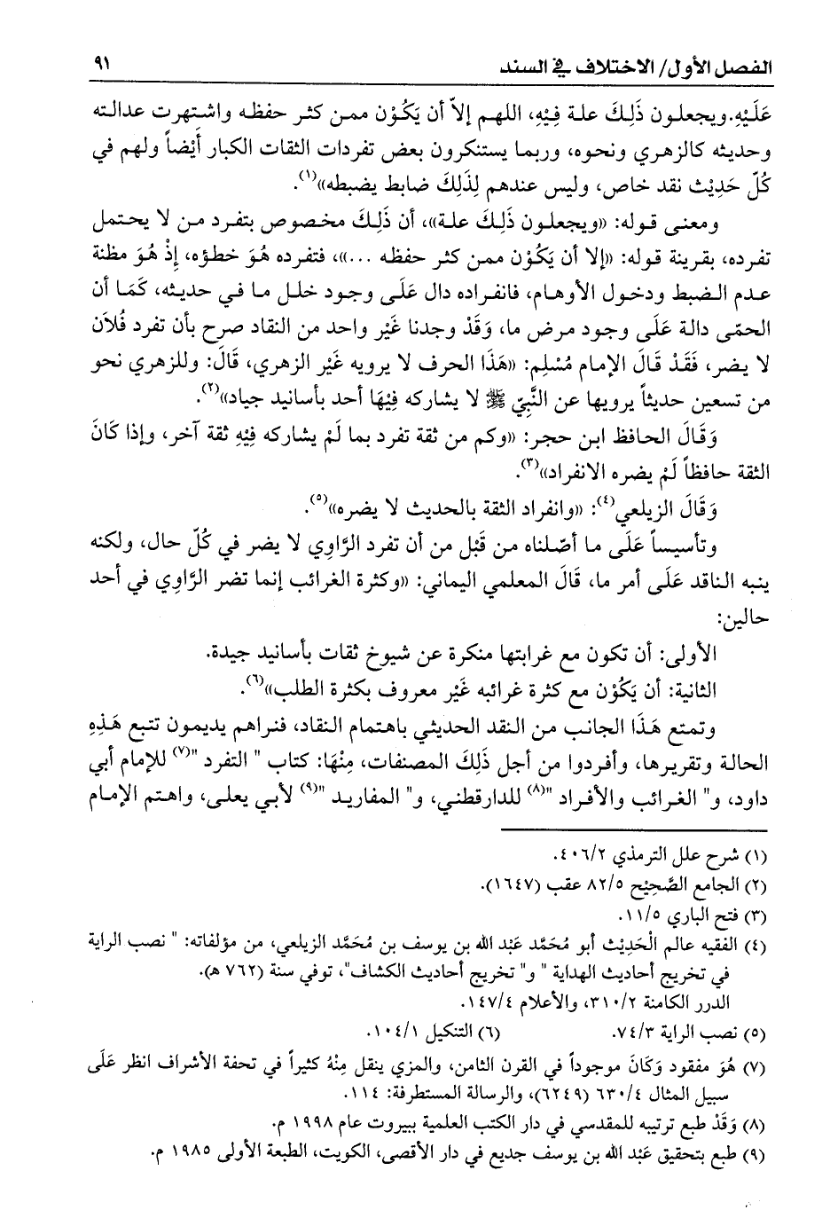 عَلَيْهِ. ويجعلون ذَلِكَ علة فِيْهِ، اللهم إلاّ أن يَكُوْن ممن كثر حفظه واشتهرت عدالته وحديثه كالزهري ونحوه، وربما يستنكرون بعض تفردات الثقات الكبار أَيْضاً ولهم في كُلّ حَدِيْث نقد خاص، وليس عندهم لِذَلِكَ ضابط يضبطه)) (¬1).