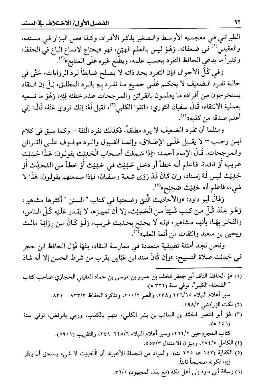 وفي كُلّ الأحوال فإن التفرد بحد ذاته لا يصلح ضابطاً لرد الروايات، حَتَّى في حالة تفرد الضعيف لا يحكم عَلَى جميع ما تفرد بِهِ بالرد المطلق، بَلْ إن النقاد يستخرجون من أفراده ما يعلمون بالقرائن والمرجحات عدم خطئه فِيْهِ، وَهُوَ ما نسميه بعملية الانتقاء، قَالَ سفيان الثوري: ((اتقوا الكلبي (¬3)، فقيل لَهُ: إنك تروي عَنْهُ، قَالَ: إني أعلم صدقه من كذبه)) (¬4).