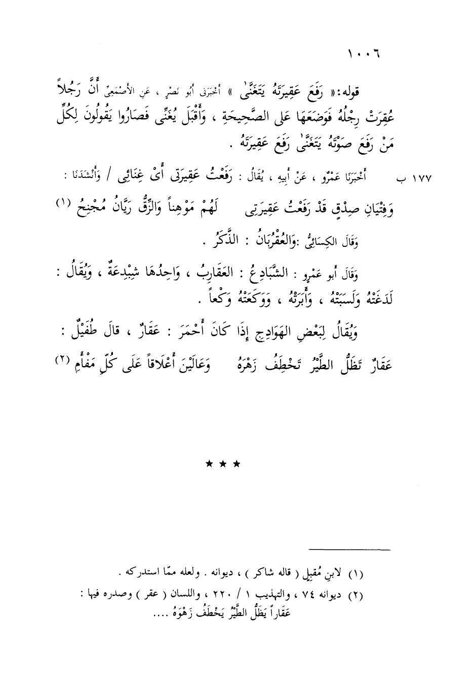 قَوْلُهُ: «رَفَعَ عَقِيرَتَهُ يَتَغَنَّى» أَخْبَرَنِي أَبُو نَصْرٍ، عَنِ الْأَصْمَعِيِّ، أَنَّ رَجُلًا عُقِرَتْ رِجْلُهُ، فَوَضَعَهَا عَلَى الصَّحِيحَةِ وَأَقْبَلَ يُغَنِّي، فَصَارُوا يَقُولُونَ لِكُلِّ مَنْ رَفَعَ صَوْتَهُ يَتَغَنَّى: رَفَعَ عَقِيرَتَهُ أَخْبَرَنَا عَمْرٌو، عَنْ أَبِيهِ: يُقَالُ: رَفَعْتُ عَقِيرَتِي: أَيْ غِنَائِي، وَأَنْشَدَنَا: