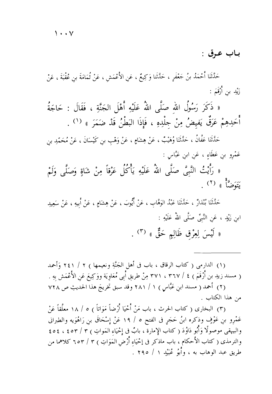 حَدَّثَنَا أَحْمَدُ بْنُ جَعْفَرٍ، حَدَّثَنَا وَكِيعٌ، عَنِ الْأَعْمَشِ، عَنْ ثُمَامَةَ بْنِ عُقْبَةَ، عَنْ زَيْدِ بْنِ أَرْقَمَ: ذَكَرَ رَسُولُ اللَّهِ صَلَّى اللَّهُ عَلَيْهِ أَهْلَ الْجَنَّةِ فَقَالَ: «§حَاجَةُ أَحَدِهِمْ عَرَقٌ يَفِيضُ مِنْ جِلْدِهِ، فَإِذَا الْبَطْنُ قَدْ ضَمَرَ»