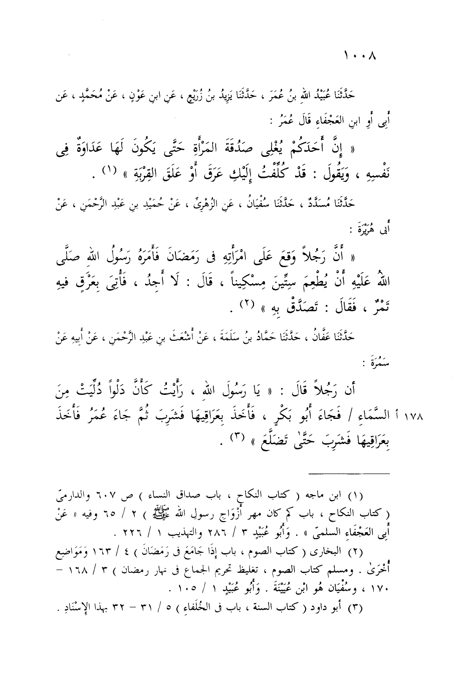 حَدَّثَنَا مُسَدَّدٌ، حَدَّثَنَا سُفْيَانُ، عَنِ الزُّهْرِيِّ، عَنْ حُمَيْدِ بْنِ عَبْدِ الرَّحْمَنِ، عَنْ أَبِي هُرَيْرَةَ، أَنَّ §رَجُلًا وَقَعَ عَلَى امْرَأَتِهِ فِي رَمَضَانَ، فَأَمَرَهُ رَسُولُ اللَّهِ صَلَّى اللَّهُ عَلَيْهِ أَنْ يُطْعِمَ سِتِّينَ مِسْكِينًا، قَالَ: لَا أَجِدُ، فَأُتِيَ بِعَرَقٍ فِيهِ تَمْرٌ، فَقَالَ: «تَصَدَّقْ بِهِ»