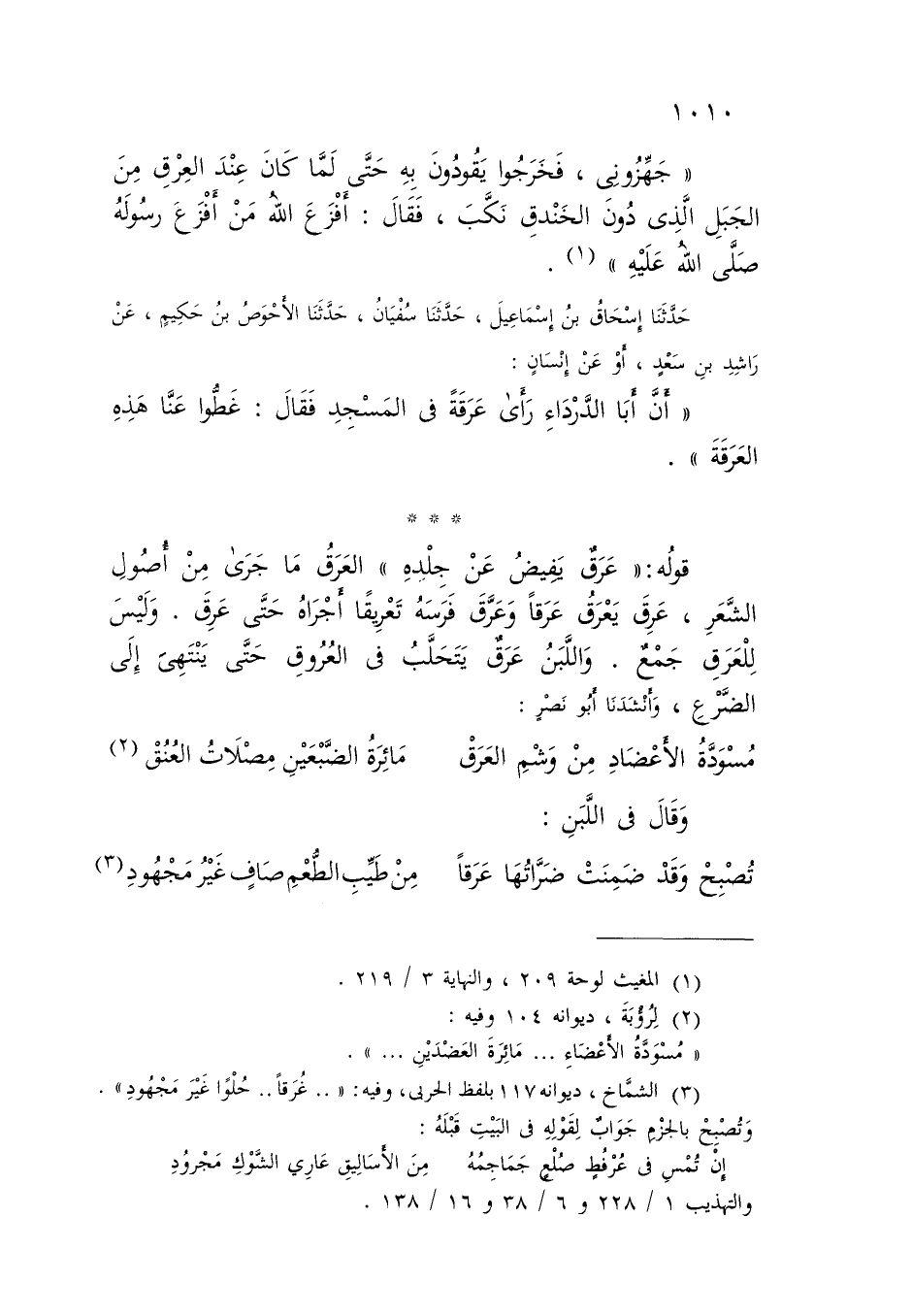 حَدَّثَنَا إِسْحَاقُ بْنُ إِسْمَاعِيلَ، حَدَّثَنَا سُفْيَانُ، حَدَّثَنَا الْأَحْوَصُ بْنُ حَكِيمٍ، عَنْ رَاشِدِ بْنِ سَعْدٍ، أَوْ عَنْ إِنْسَانٍ، أَنَّ أَبَا الدَّرْدَاءِ رَأَى عَرَقَةً فِي الْمَسْجِدِ فَقَالَ: «§غَطُّوا عَنَّا هَذِهِ الْعَرَقَةَ» قَوْلُهُ: «عَرَقٌ يَفِيضُ عَنْ جِلْدِهِ» ، الْعَرَقُ مَا جَرَى مِنْ أُصُولِ الشَّعَرِ، عَرِقَ يَعْرَقُ عَرَقًا، وَعَرَّقَ فَرَسَهُ تَعْرِيقًا: أَجْرَاهُ حَتَّى عَرِقَ، وَلَيْسَ لِلْعَرَقِ جَمْعٌ، وَاللَّبَنُ عَرَقٌ يَتَحَلَّبُ فِي الْعُرُوقِ حَتَّى يَنْتَهِيَ إِلَى الضَّرْعِ وَأَنْشَدَنَا أَبُو نَصْرٍ: