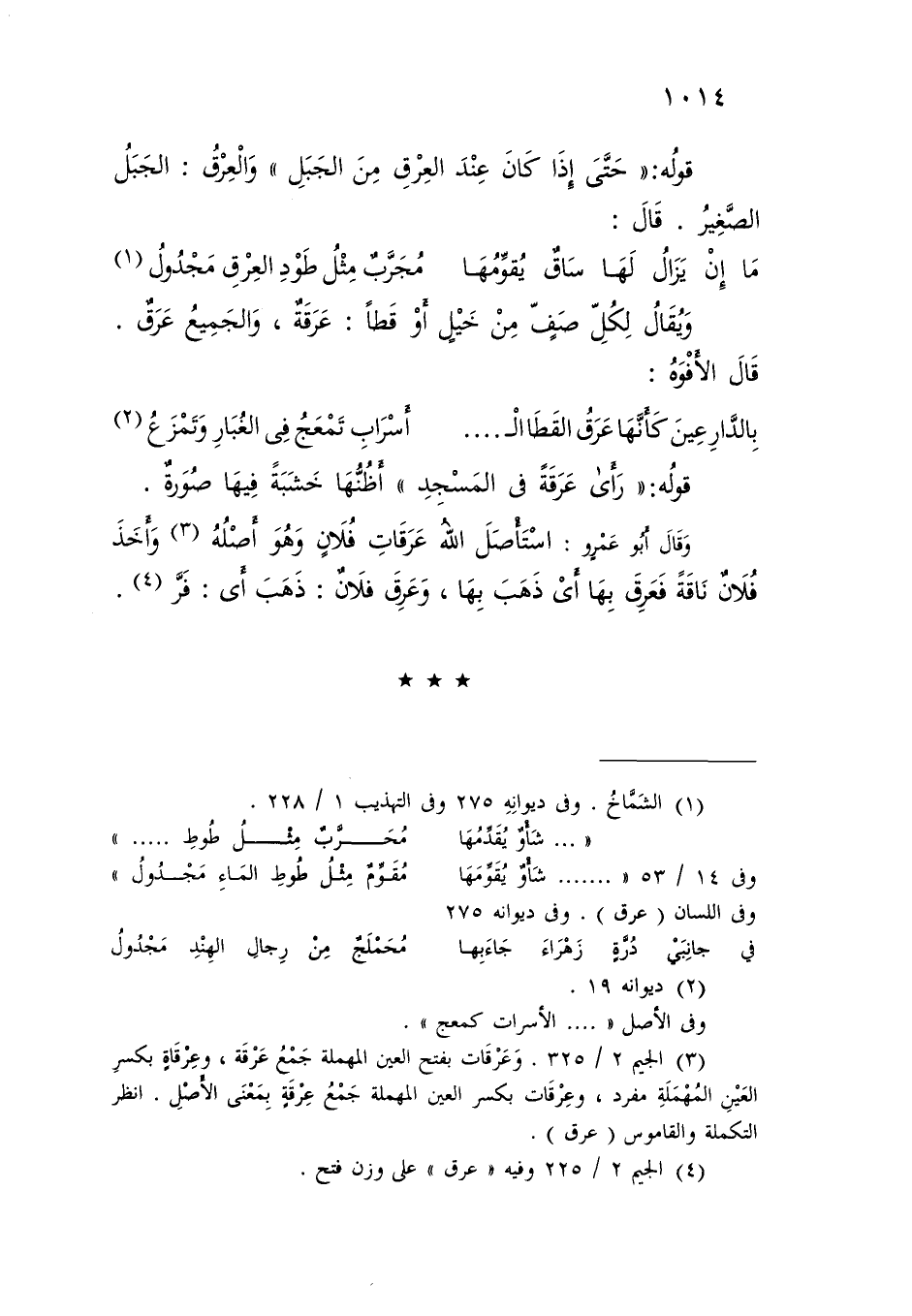 وَيُقَالُ لِكُلِّ صَفٍّ مِنْ خَيْلٍ أَوْ قَطًا: عَرَقَةٌ، وَالْجَمِيعُ عَرَقٌ قَالَ الْأَفْوَهُ: