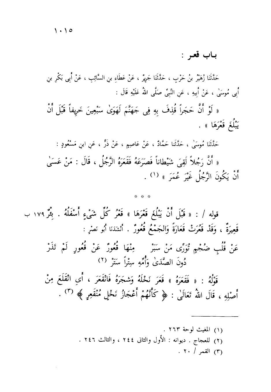 حَدَّثَنَا مُوسَى، حَدَّثَنَا حَمَّادٌ، عَنْ عَاصِمٍ، عَنْ زِرٍّ، عَنِ ابْنِ مَسْعُودٍ أَنَّ رَجُلًا لَقِيَ شَيْطَانًا فَصَرَعَهُ، فَقَعَرَهُ الرَّجُلُ، قَالَ: «§مَنْ عَسَى أَنْ يَكُونَ الرَّجُلُ غَيْرَ عُمَرَ» قَوْلُهُ: «قَبْلَ أَنْ يَبْلُغَ قَعْرَهَا» ، قَعْرُ كُلِّ شَيْءٍ أَسْفَلُهُ، بِئْرٌ قَعِيرَةٌ، وَقَدْ قَعُرَتْ قَعَارَةً، وَالْجَمْعُ قُعُورٌ أَنْشَدَنَا أَبُو نَصْرٍ: