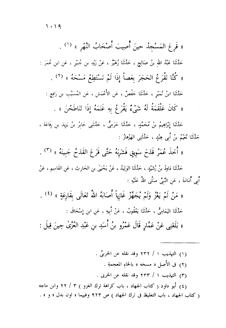 حَدَّثَنَا دَاوُدُ بْنُ رُشَيْدٍ، حَدَّثَنَا الْوَلِيدُ، عَنْ يَحْيَى بْنِ الْحَارِثِ، عَنِ الْقَاسِمِ، عَنْ أَبِي أُمَامَةَ، عَنِ النَّبِيِّ صَلَّى اللَّهُ عَلَيْهِ: «§مَنْ لَمْ يَغْزُ، وَلَمْ يُجَهِّزْ غَازِيًا، أَصَابَهُ اللَّهُ تَعَالَى بِقَارِعَةٍ»