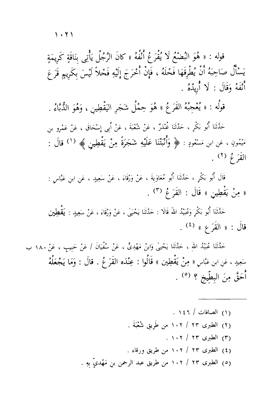 حَدَّثَنَا أَبُو بَكْرٍ وَعُبَيْدُ اللَّهِ، قَالَا: حَدَّثَنَا يَحْيَى، عَنْ وَرْقَاءَ، عَنْ سَعِيدٍ: " {§يَقْطِينٍ} [الصافات: 146] ، قَالَ: الْقَرَعُ "