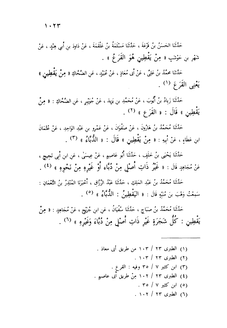 حَدَّثَنِي يَحْيَى بْنُ خَلَفٍ، حَدَّثَنَا أَبُو عَاصِمٍ، عَنْ عِيسَى، عَنِ ابْنِ أَبِي نَجِيحٍ، عَنْ مُجَاهِدٍ قَالَ: «§غَيْرُ ذَاتِ أَصْلٍ مِنْ دُبَّاءٍ أَوْ غَيْرِهِ مِنْ نَحْوِهِ»
