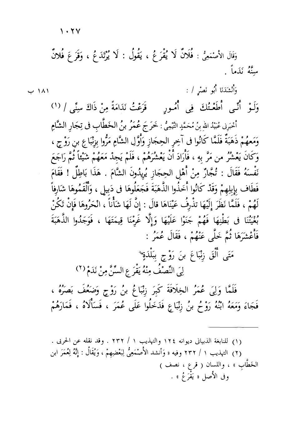 أَخْبَرَنِي عُبَيْدُ اللَّهِ بْنُ مُحَمَّدٍ التَّيْمِيُّ: خَرَجَ عُمَرُ بْنُ الْخَطَّابِ فِي تُجَّارِ الشَّامِ، وَمَعَهُمْ ذَهَبَةٌ، فَلَمَّا كَانُوا فِي آخِرِ الْحِجَازِ، وَأَوَّلِ الشَّامِ مَرُّوا بِزِنْبَاعِ بْنِ رَوْحٍ، وَكَانَ يَعْشُرُ مَنْ مَرَّ بِهِ، §فَأَرَادَ أَنْ يَعْشُرَهُمْ، فَلَمْ يَجِدْ مَعَهُمْ شَيْئًا، ثُمَّ رَاجَعَ نَفْسَهُ، فَقَالَ: تُجَّارٌ مِنْ أَهْلِ الْحِجَازِ يُرِيدُونَ الشَّامَ، هَذَا بَاطِلٌ، فَقَامَ فَطَافَ بِإِبِلِهِمْ، وَقَدْ كَانُوا أَخَذُوا الذَّهَبَةَ، فَجَعَلُوهَا فِي دَبِيلٍ، وَأَلْقَمُوهَا شَارِفًا لَهُمْ، فَلَمَّا نَظَرَ إِلَيْهَا تَذْرفُ عَيْنَاهَا، قَالَ: إِنَّ لَهَا شَأْنًا، انْحَرُوهَا، فَإِنْ تَكُنْ بُغْيَتُنَا فِي بَطْنِهَا، فَهُمْ جَنَوْا عَلَيْهَا، وَإِلَّا غَرِمْنَا قِيمَتَهَا، فَوَجَدُوا الذَّهَبَةَ، فَأَعْشَرَهَا، ثُمَّ خَلَّى عَنْهُمْ، فَقَالَ عُمَرُ: