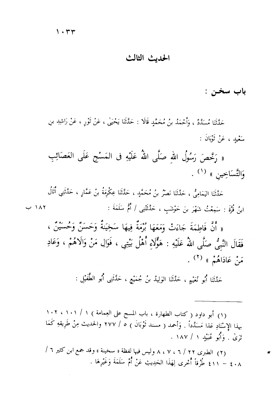 حَدَّثَنَا الْيَمَامِيُّ، حَدَّثَنَا نَضْرُ بْنُ مُحَمَّدٍ، حَدَّثَنَا عِكْرِمَةُ بْنُ عَمَّارٍ، حَدَّثَنِي أُثَالُ بْنُ قُرَّةَ، سَمِعْتُ شَهْرَ بْنَ حَوْشَبٍ، حَدَّثَتْنِي أُمُّ سَلَمَةَ، أَنَّ فَاطِمَةَ، جَاءَتْ وَمَعَهَا بُرْمَةٌ فِيهَا سَخِينَةٌ، وَحَسَنٌ وَحُسَيْنٌ، فَقَالَ رَسُولُ اللَّهِ صَلَّى اللَّهُ عَلَيْهِ: «§هَؤُلَاءِ أَهْلُ بَيْتِي، فَوَالِ مَنْ وَالِاهُمْ، وَعَادِ مَنْ عَادَاهُمْ»