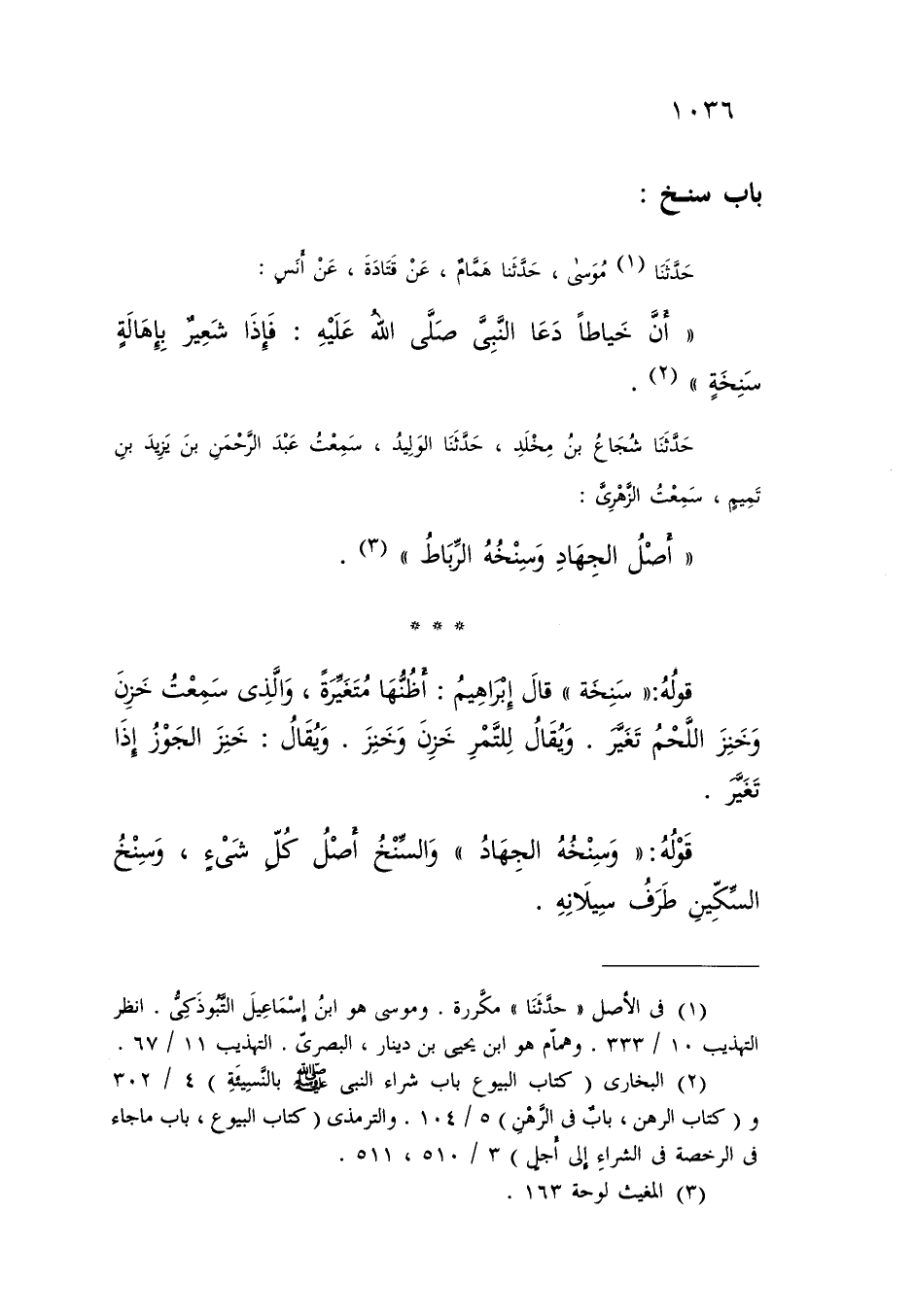 حَدَّثَنَا شُجَاعُ بْنُ مَخْلَدٍ، حَدَّثَنَا الْوَلِيدُ، سَمِعْتُ عَبْدَ الرَّحْمَنِ بْنَ يَزِيدَ بْنِ تَمِيمٍ، سَمِعْتُ الزُّهْرِيَّ: «§أَصْلُ الْجِهَادِ، وَسِنْخُهُ الرِّبَاطُ» قَوْلُهُ: «سَنِخَةٍ» قَالَ إِبْرَاهِيمُ: أَظُنُّهَا مُتَغَيِّرَةٌ، وَالَّذِي سَمِعْتُ خَزِنَ، وَخَنِزَ اللَّحْمُ: تَغَيَّرَ، وَيُقَالُ لِلتَّمْرِ خَزِنَ، وَخَنِزَ، وَيُقَالُ: خَنِزَ الْجَوْزُ: إِذَا تَغَيَّرَ قَوْلُهُ: «وَسِنْخُهُ الْجِهَادُ» ، وَالسِّنْخُ أَصْلُ كُلِّ شَيْءٍ، وَسِنْخُ السِّكِّينِ طَرَفُ سِيلَانِهِ -[1037]- أَخْبَرَنِي أَبُو نَصْرٍ، عَنِ الْأَصْمَعِيِّ: «السِّنْخُ مَا تَغَيَّبَ فِي اللِّثَةِ مِنَ الْأَسْنَانِ» وَقَالَ أَبُو عَمْرٍو، عَنِ الْعُكْلِيِّ: «مَازَالَ يُسَنِّخُهَا حَتَّى أَدْرَكَهَا، وَالتَّسْنِيخُ» : طَلِبَةُ الشَيْءِ، وَالسُّنْخَتَانِ: قَامَتَا الْبِئْرِ