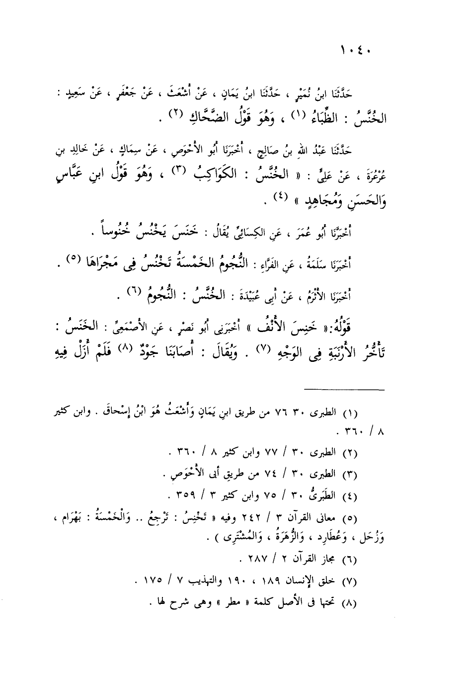 حَدَّثَنَا عَبْدُ اللَّهِ بْنُ صَالِحٍ، أَخْبَرَنَا أَبُو الْأَحْوَصِ، عَنْ سِمَاكٍ، عَنْ خَالِدِ بْنِ عَرْعَرَةَ، عَنْ عَلِيٍّ: §الْخُنَّسُ: «الْكَوَاكِبُ» وَهُوَ قَوْلُ ابْنِ عَبَّاسٍ، وَالْحَسَنِ وَمُجَاهِدٍ أَخْبَرَنَا أَبُو عُمَرَ، عَنِ الْكِسَائِيِّ: يُقَالُ: خَنِسَ يَخْنُسُ خُنُوسًا أَخْبَرَنَا سَلَمَةُ، عَنِ الْفَرَّاءِ: النُّجُومُ الْخَمْسَةُ تَخْنُسُ فِي مَجْرَاهَا أَخْبَرَنَا الْأَثْرَمُ، عَنْ أَبِي عُبَيْدَةَ: الْخُنَّسُ: النُّجُومُ قَوْلُهُ: «خَنِسَ الْأَنْفُ» أَخْبَرَنِي أَبُو نَصْرٍ، عَنِ الْأَصْمَعِيِّ: الْخَنَسُ: تَأَخُّرُ الْأَرْنَبَةِ فِي الْوَجْهِ، وَيُقَالُ: أَصَابَنَا جَوْدٌ، فَلَمْ أَزَلْ فِيهِ -[1041]-، حَتَّى خَنَسَ عَنِّي بِمَكَانِ كَذَا، وَكَذَا، وَحَتَّى انْقَطَعَ عَنِّي بِمَكَانِ كَذَا، ثُمَّ أَخَذْتُ مَطَرًا دُونَ. . . .، حَتَّى إِذَا بَلَغْتُ كَذَا اقْتَطَعْتُهُ عَلَى مَطَرٍ دُونَهُ