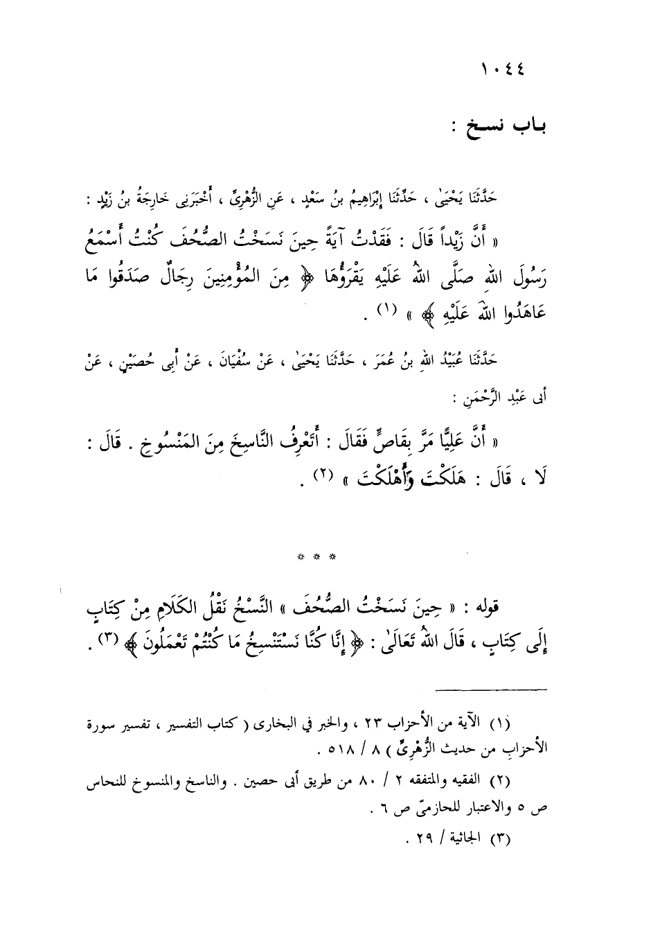 حَدَّثَنَا عُبَيْدُ اللَّهِ بْنُ عُمَرَ، حَدَّثَنَا يَحْيَى، عَنْ سُفْيَانَ، عَنْ أَبِي حُصَيْنٍ، عَنْ أَبِي عَبْدِ الرَّحْمَنِ، أَنَّ عَلِيًّا، مَرَّ بِقَاصٍّ، فَقَالَ: «§أَتَعْرِفُ النَّاسِخَ مِنَ الْمَنْسُوخِ» قَالَ: لَا، قَالَ: «هَلَكْتَ وَأَهْلَكْتَ» قَوْلُهُ: «حِينَ نَسَخْتُ الصُّحُفَ» النَّسْخُ: نَقْلُ الْكَلَامِ مِنْ كِتَابٍ إِلَى كِتَابٍ، قَالَ اللَّهُ تَعَالَى: {إِنَّا كُنَّا نَسْتَنْسِخُ مَا كُنْتُمْ تَعْمَلُونَ} [الجاثية: 29]