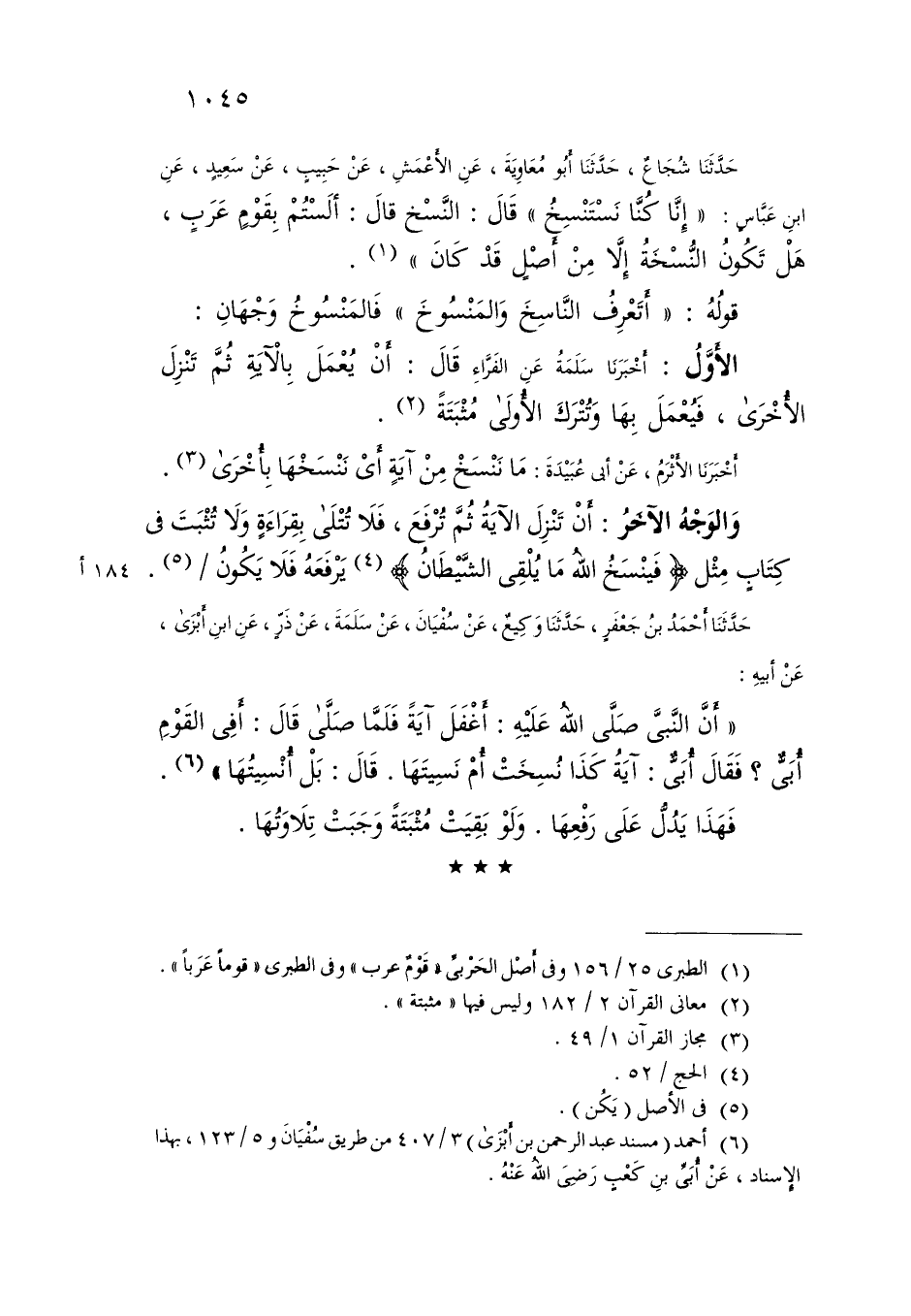 حَدَّثَنَا شُجَاعٌ، حَدَّثَنَا أَبُو مُعَاوِيَةَ، عَنِ الْأَعْمَشِ، عَنْ حَبِيبٍ، عَنْ سَعِيدٍ، عَنِ ابْنِ عَبَّاسٍ: " {§إِنَّا كُنَّا نَسْتَنْسِخُ} [الجاثية: 29] "، قَالَ: النَّسْخُ، قَالَ: أَلَسْتُمْ بِقَوْمٍ عَرَبٍ هَلْ تَكُونُ النُّسْخَةُ إِلَّا مِنْ أَصْلٍ قَدْ كَانَ " قَوْلُهُ: «أَتَعْرِفُ النَّاسِخَ وَالْمَنْسُوخَ» فَالْمَنْسُوخُ وَجْهَانِ: الْأَوَّلُ: أَخْبَرَنَا سَلَمَةُ، عَنِ الْفَرَّاءِ، قَالَ: أَنْ يُعْمَلَ بِالْآيَةِ، ثُمَّ تَنْزِلَ الْأُخْرَى، فَيُعْمَلَ بِهَا، وَتَتْرُكَ الْأُولَى مُثْبَتَةً