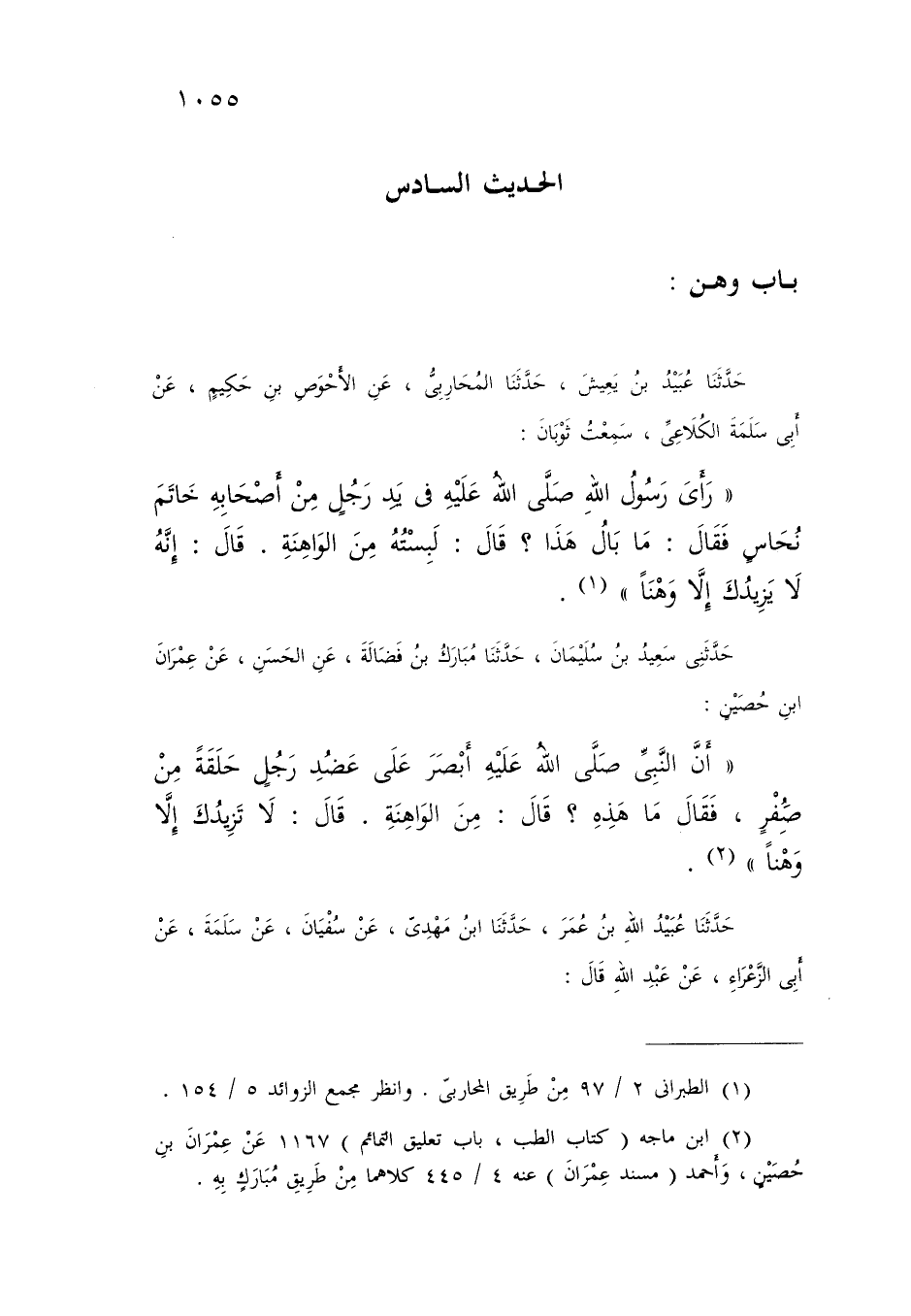حَدَّثَنِي سَعِيدُ بْنُ سُلَيْمَانَ، حَدَّثَنَا مُبَارَكُ بْنُ فَضَالَةَ، عَنِ الْحَسَنِ، عَنْ عِمْرَانَ بْنِ حُصَيْنٍ، أَنَّ رَسُولَ اللَّهِ صَلَّى اللَّهُ عَلَيْهِ أَبْصَرَ عَلَى عَضُدِ رَجُلٍ حَلْقَةً مِنْ صُفْرٍ، فَقَالَ: «مَا هَذِهِ؟» قَالَ: مِنَ الْوَاهِنَةِ قَالَ: «§لَا تَزِيدُكَ إِلَّا وَهْنًا»