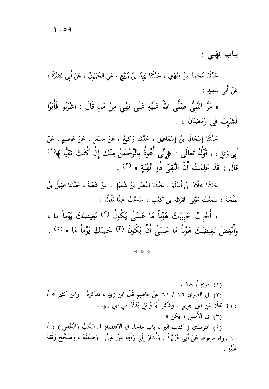حَدَّثَنَا خَلَّادُ بْنُ أَسْلَمَ، حَدَّثَنَا النَّضْرُ بْنُ شُمَيْلٍ، عَنْ شُعْبَةَ، حَدَّثَنَا عَقِيلُ بْنُ طَلْحَةَ: سَمِعْتُ مَوْلَى الْقَرَظَةِ بْنِ كَعْبٍ، سَمِعْتُ عَلِيًّا، يَقُولُ: «§أَحْبِبْ حَبِيبَكَ هَوْنًا مَا عَسَى يَكُونُ بَغِيضَكَ يَوْمًا مَا، وَأَبْغِضْ بَغِيضَكَ هَوْنًا مَا عَسَى أَنْ يَكُونَ حَبِيبَكَ يَوْمًا مَا» -[1060]- قَوْلُهُ: «أَتَى عَلَى نِهْيٍ مِنْ مَاءٍ»