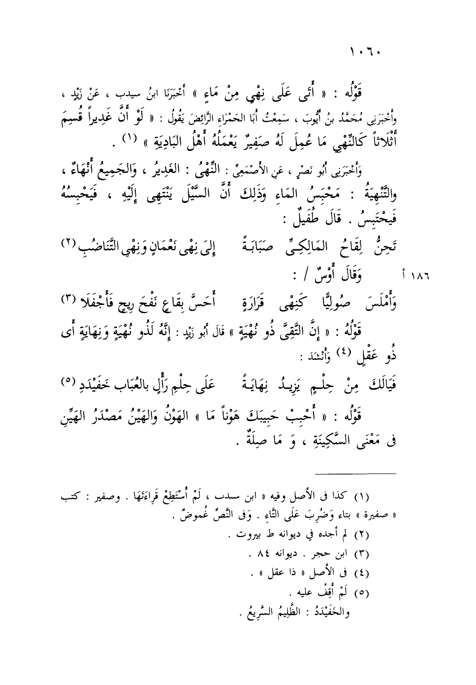 أَخْبَرَنَا ابْنُ سَيْدَبَ، عَنْ زَيْدٍ، وَأَخْبَرَنِي مُحَمَّدُ بْنُ أَيُّوبَ، سَمِعْتُ أَبَا الْحَمْرَاءِ الرَّائِضَ يَقُولُ: «§لَوْ أَنَّ غَدِيرًا قُسِمَ أَثْلَاثًا كَالنِّهْيِ مَا عُمِلَ لَهُ صَفِيرٌ يَعْمَلُهُ أَهْلُ الْبَادِيَةِ» وَأَخْبَرَنِي أَبُو نَصْرٍ، عَنِ الْأَصْمَعِيِّ: النِّهْيُ: الْغَدِيرُ، وَالْجَمِيعُ أَنْهَاءٌ، وَالتَّنْهِيَةُ: مَحْبِسُ الْمَاءِ، وَذَلِكَ أَنَّ السَّيْلَ يَنْتَهِي إِلَيْهِ، فَيَحْبِسُهُ فَيَحْتَبِسُ قَالَ طُفَيْلٌ: