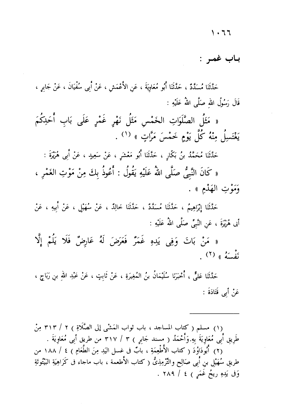 حَدَّثَنَا مُسَدَّدٌ، حَدَّثَنَا أَبُو مُعَاوِيَةَ، عَنِ الْأَعْمَشِ، عَنْ أَبِي سُفْيَانَ، عَنْ جَابِرٍ، قَالَ رَسُولُ اللَّهِ صَلَّى اللَّهُ عَلَيْهِ: «§مَثَلُ الصَّلَوَاتِ الْخَمْسِ مَثَلُ نَهَرٍ غَمْرٍ عَلَى بَابِ أَحَدِكُمْ يَغْتَسِلُ مِنْهُ كُلَّ يَوْمٍ خَمْسَ مَرَّاتٍ»