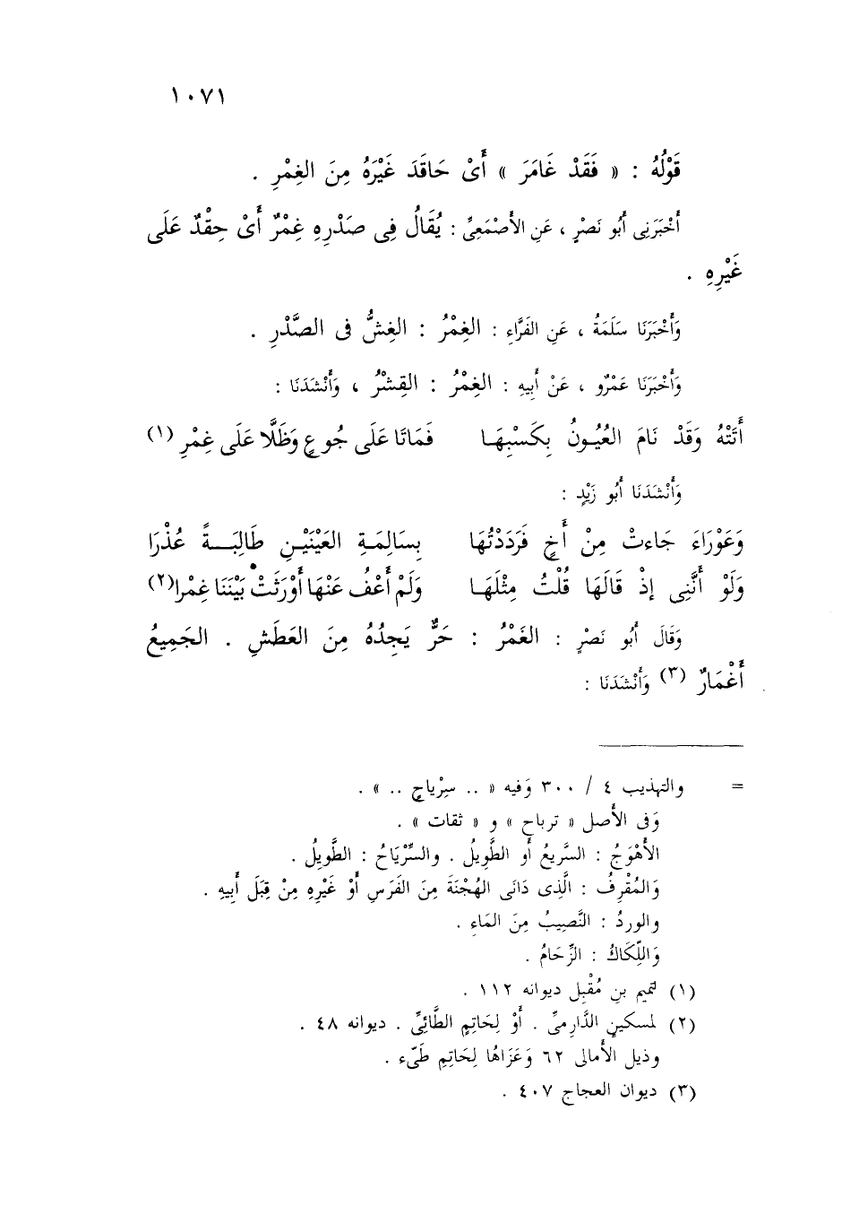 وَقَالَ أَبُو نَصْرٍ: الْغِمْرُ: حَرٌّ يَجِدُهُ مِنَ الْعَطَشِ، الْجَمِيعُ أَغْمَارٌ، وَأَنْشَدَنَا
