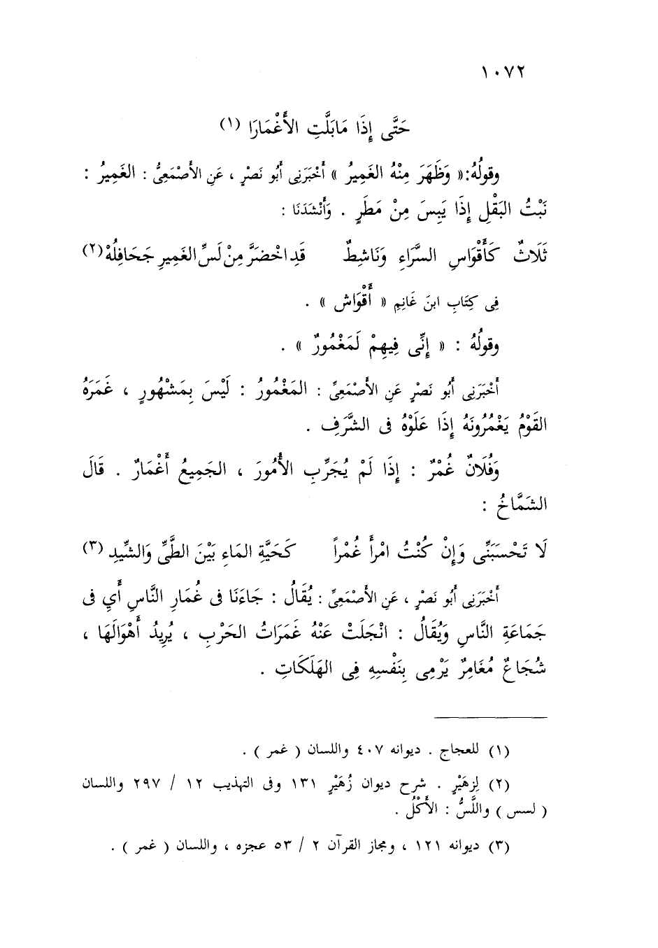 : حَتَّى إِذَا مَا بَلَّتِ الْأَغْمَارَا وَقَوْلُهُ: «وَظَهَرَ مِنْهُ الْغَمِيرُ» أَخْبَرَنِي أَبُو نَصْرٍ، عَنِ الْأَصْمَعِيِّ: الْغَمِيرُ: نَبْتُ الْبَقْلِ إِذَا يَبِسَ مِنْ مَطَرٍ، وَأَنْشَدَنَا: