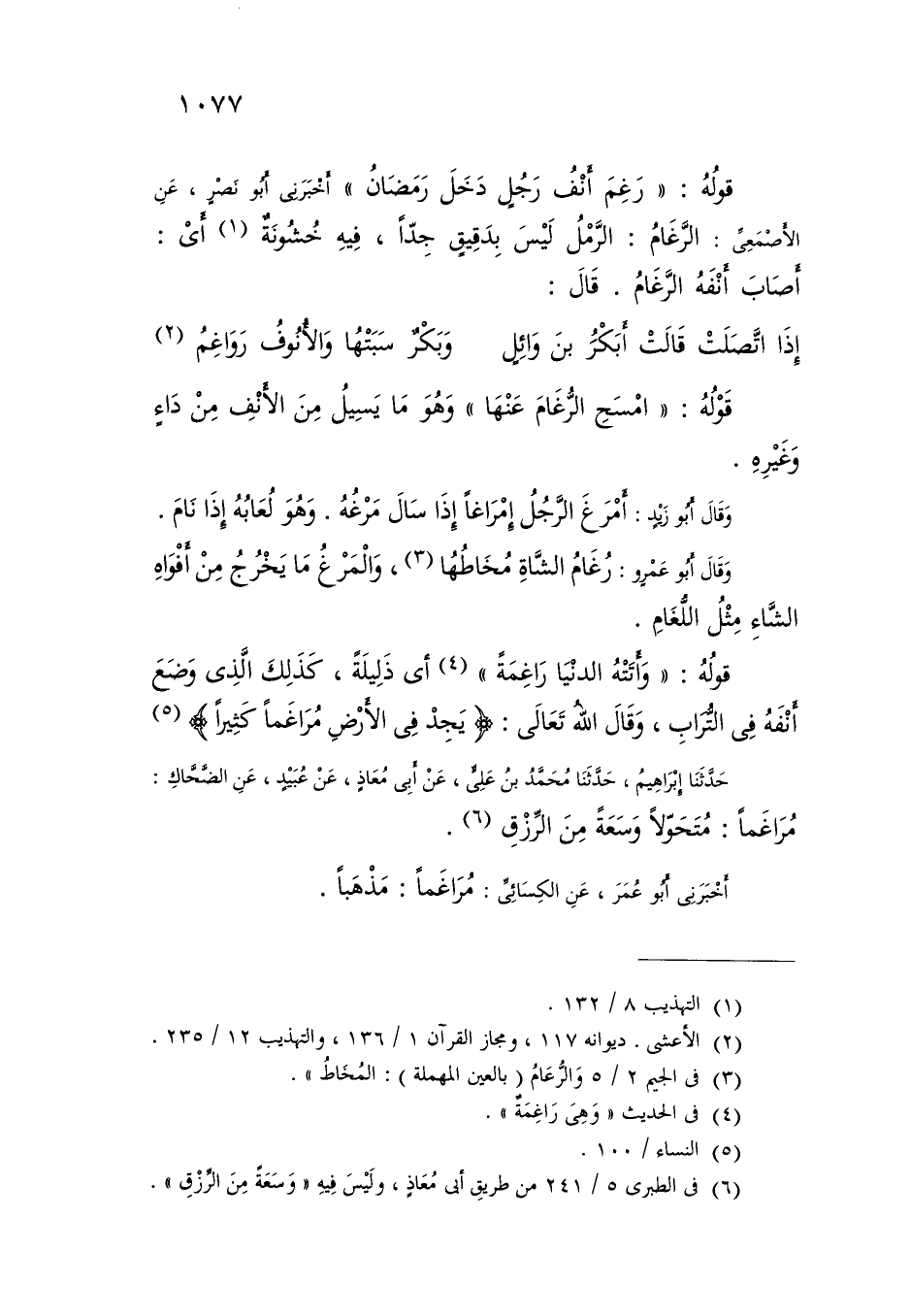 أَخْبَرَنِي أَبُو عُمَرَ، عَنِ الْكِسَائِيِّ: " {§مُرَاغَمًا} [النساء: 100] : مَذْهَبًا " -[1078]- أَخْبَرَنَا سَلَمَةُ، عَنِ الْفَرَّاءِ: " مُرَاغَمًا وَمُرَاغَمَةً: مُضْطَرَبٌ وَمَذْهَبٌ وَأَخْبَرَنَا الْأَثْرَمُ، عَنْ أَبِي عُبَيْدَةَ: " الْمُرَاغَمُ وَالْمُهَاجَرُ وَاحِدٌ رَاغَمْتُ وَهَاجَرْتُ قَوْمِي وَهِيَ الْمَذَاهِبُ قَالَ: