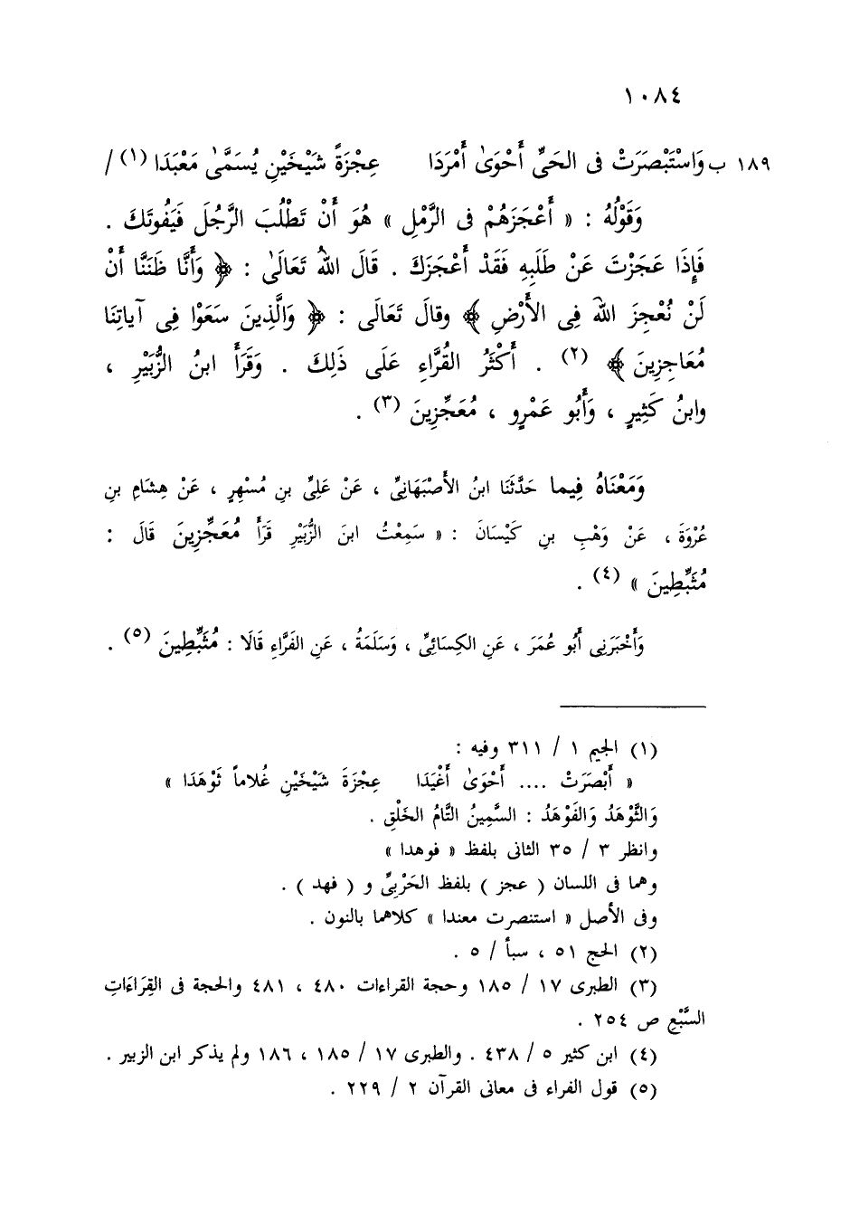 حَدَّثَنَا ابْنُ الْأَصْبَهَانِيِّ، عَنْ عَلِيِّ بْنِ مُسْهِرٍ، عَنْ هِشَامِ بْنِ عُرْوَةَ، عَنْ وَهْبِ بْنِ كَيْسَانَ: سَمِعْتُ ابْنَ الزُّبَيْرِ §قَرَأَ: (مُعَجِّزِينَ) ، قَالَ: مُثَبِّطِينَ "