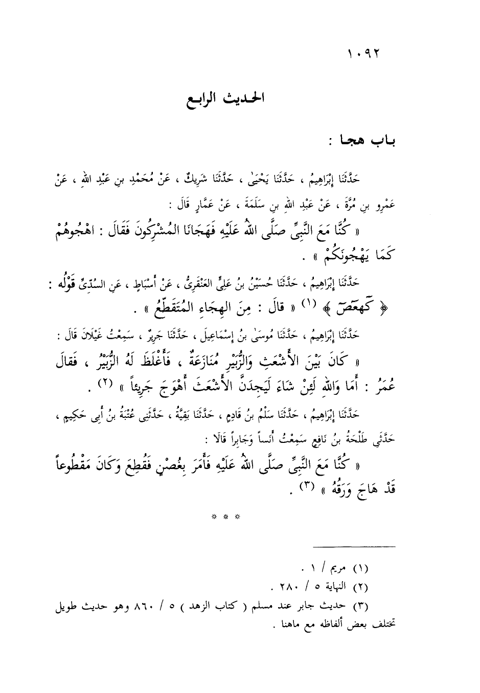 حَدَّثَنَا إِبْرَاهِيمُ، حَدَّثَنَا سَلْمُ بْنُ قَادِمٍ، حَدَّثَنَا بَقِيَّةُ، حَدَّثَنِي عُتْبَةُ بْنُ أَبِي حَكِيمٍ، حَدَّثَنِي طَلْحَةُ بْنُ نَافِعٍ، سَمِعْتُ أَنَسًا، وَجَابِرًا، قَالَا: «§كُنَّا مَعَ النَّبِيِّ صَلَّى اللَّهُ عَلَيْهِ، فَأَمَرَ بِغُصْنٍ فَقُطِعَ، وَكَانَ مَقْطُوعًا قَدْ هَاجَ وَرَقُهُ» -[1093]- قَوْلُهُ: «فَهَجَانَا الْمُشْرِكُونَ» يُقَالُ: هَجَا يَهْجُو هِجَاءً: ذَكَرَ الْمَسَاوِئَ بِالشِّعْرِ، قَالَ: