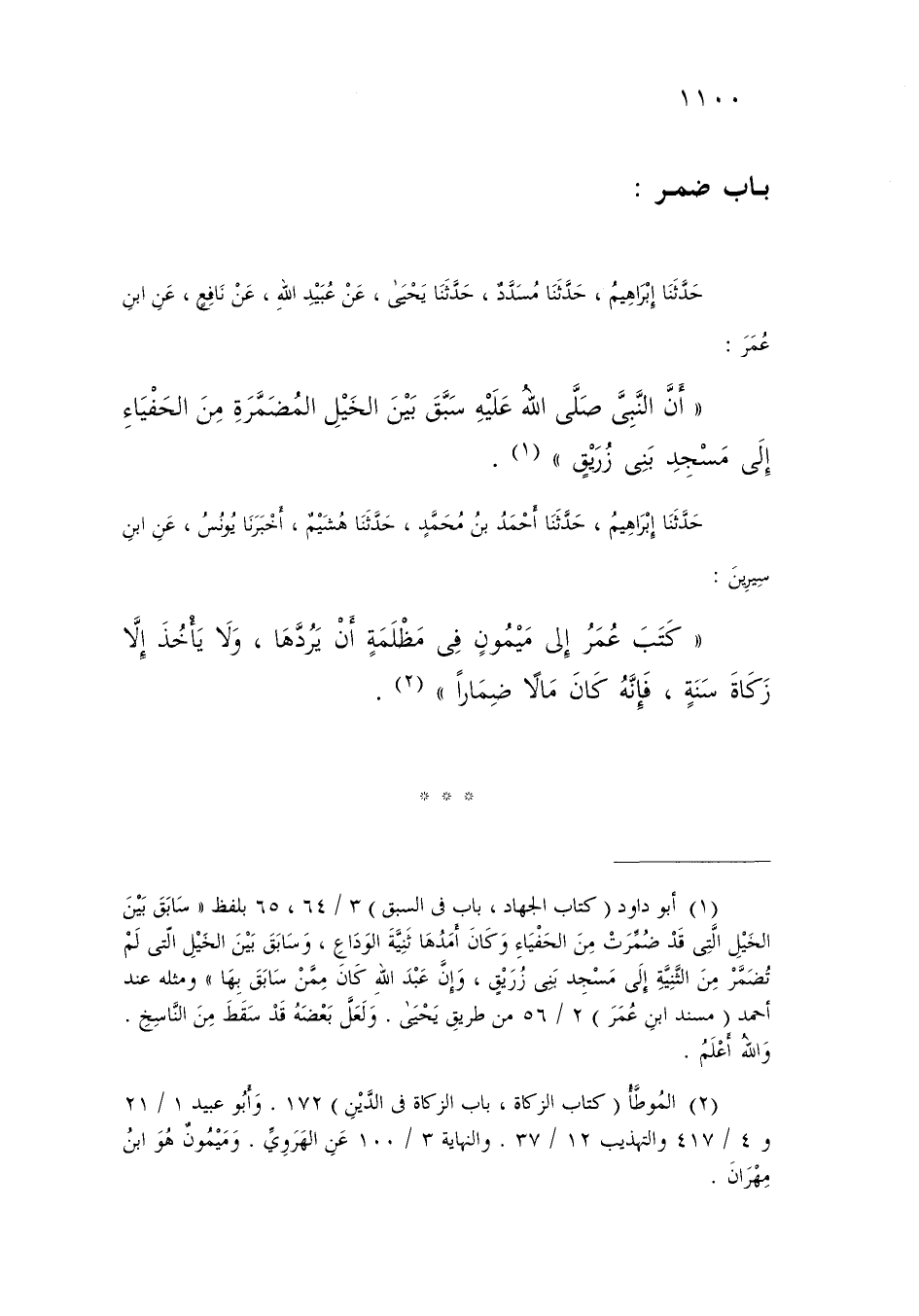 حَدَّثَنَا إِبْرَاهِيمُ، حَدَّثَنَا أَحْمَدُ بْنُ مُحَمَّدٍ، حَدَّثَنَا هُشَيْمٌ، أَخْبَرَنَا يُونُسُ، عَنِ ابْنِ سِيرِينَ: §كَتَبَ عُمَرُ إِلَى مَيْمُونٍ فِي مَظْلَمَةٍ أَنْ يَرُدَّهَا، وَلَا يَأْخُذَ إِلَّا زَكَاةَ سَنَةٍ، فَإِنَّهُ كَانَ مَالًا ضِمَارًا "