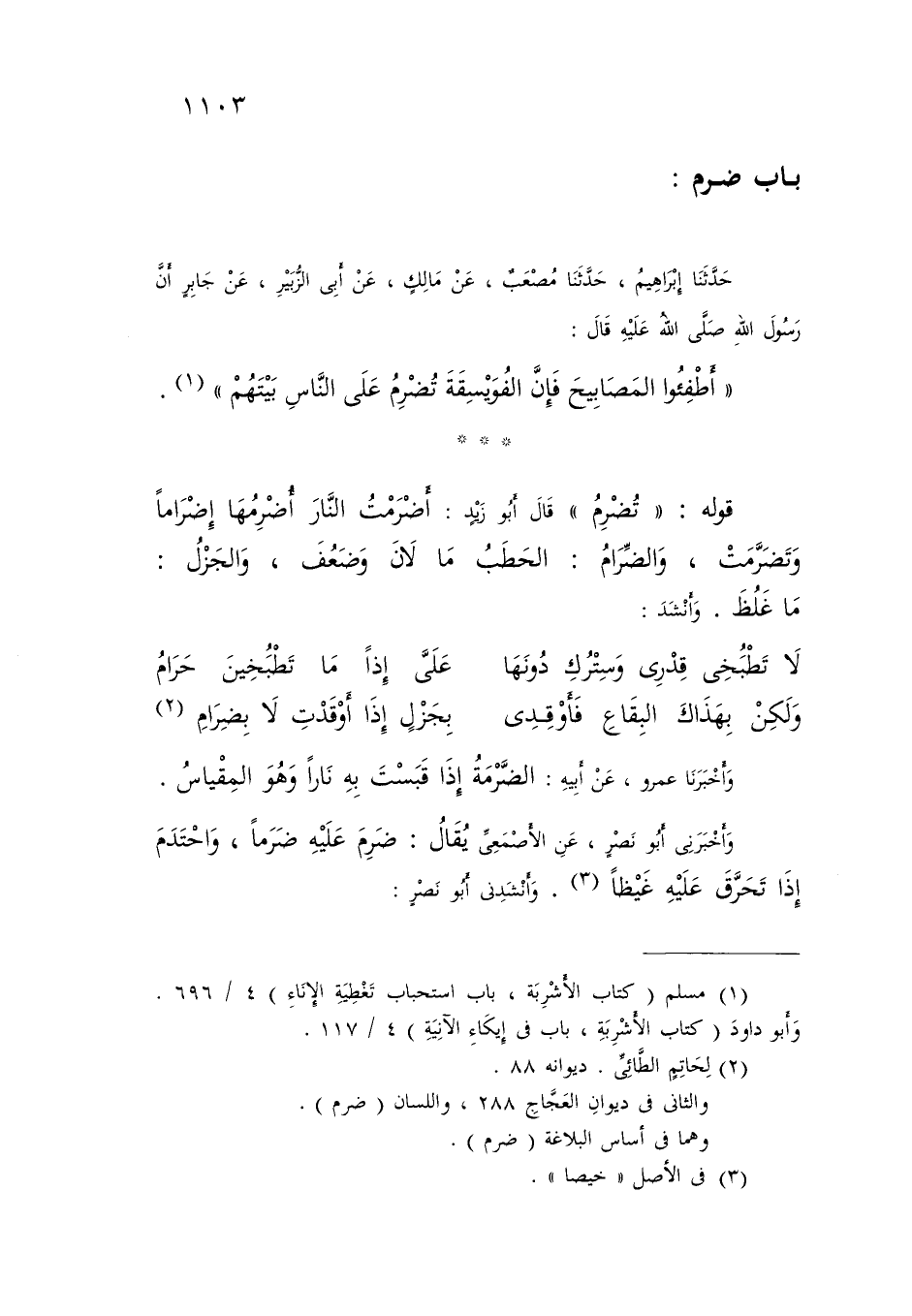 حَدَّثَنَا إِبْرَاهِيمُ، حَدَّثَنَا مُصْعَبٌ، عَنْ مَالِكٍ، عَنْ أَبِي الزُّبَيْرِ، عَنْ جَابِرٍ، أَنَّ رَسُولَ اللَّهِ صَلَّى اللَّهُ عَلَيْهِ قَالَ: «§أَطْفِئُوا الْمَصَابِيحَ، فَإِنَّ الْفُوَيْسِقَةَ تُضْرِمُ عَلَى النَّاسِ بَيْتَهُمْ» قَوْلُهُ: «تُضْرِمُ» قَالَ أَبُو يَزِيدَ: أَضْرَمْتُ النَّارَ أُضْرِمُهَا إِضْرَامًا، وَتَضَرَّمَتْ، وَالضِّرَامُ: الْحَطَبُ مَا لَانَ وَضَعُفَ، وَالْجَزْلُ: مَا غَلُظَ، وَأَنْشَدَ: