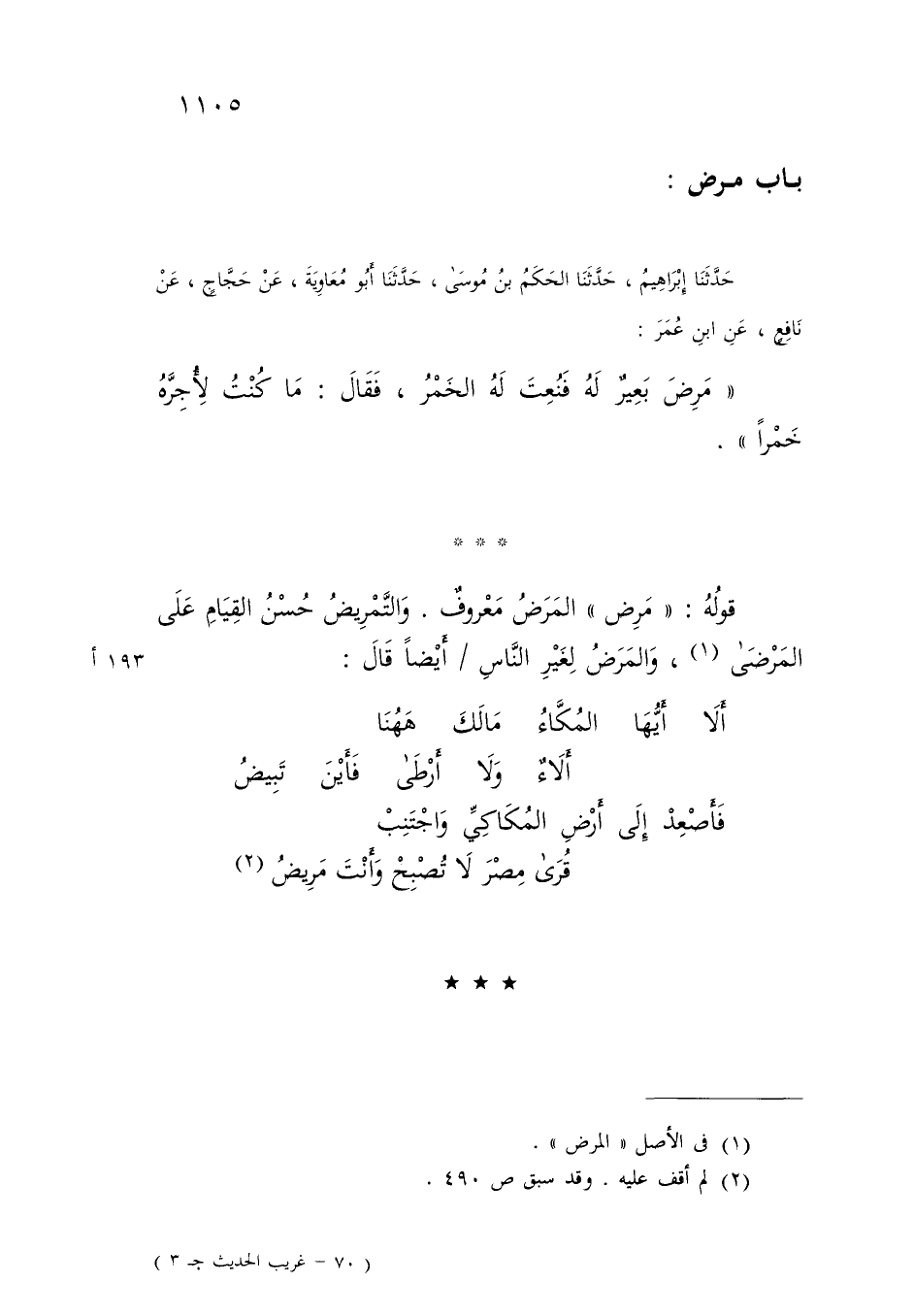 حَدَّثَنَا إِبْرَاهِيمُ، حَدَّثَنَا الْحَكَمُ بْنُ مُوسَى، حَدَّثَنَا أَبُو مُعَاوِيَةَ، عَنْ حَجَّاجٍ، عَنْ نَافِعٍ، عَنِ ابْنِ عُمَرَ: مَرِضَ بَعِيرٌ لَهُ فَنُعِتَ لَهُ الْخَمْرُ، فَقَالَ: «§مَا كُنْتُ لِأُجِرَّهُ خَمْرًا» قَوْلُهُ: «مَرِضَ» الْمَرَضُ مَعْرُوفٌ وَالتَّمْرِيضُ: حُسْنُ الْقِيَامِ عَلَى الْمَرْضَى، وَالْمَرَضُ لِغَيْرِ النَّاسِ أَيْضًا، قَالَ: