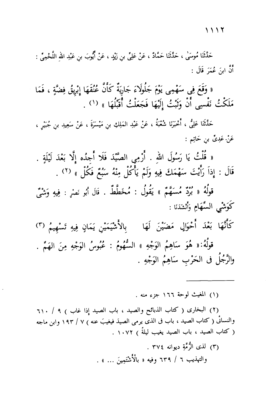 حَدَّثَنَا عَلِيٌّ، أَخْبَرَنَا شُعْبَةُ، عَنْ عَبْدِ الْمَلِكِ بْنِ مَيْسَرَةَ، عَنْ سَعِيدِ بْنِ جُبَيْرٍ، عَنْ عَدِيِّ بْنِ حَاتِمٍ: قُلْتُ: يَا رَسُولَ اللَّهِ، أَرْمِي الصَّيْدَ فَلَا أَجِدُهُ إِلَّا بَعْدَ لَيْلَةٍ؟ قَالَ: «§إِذَا رَأَيْتَ سَهْمَكَ فِيهِ وَلَمْ يَأْكُلْ مِنْهُ سَبُعٌ فَكُلْ» قَوْلُهُ: «بُرْدٌ مُسَهَّمٌ» : يَقُولُ: مُخَطَّطٌ قَالَ أَبُو نَصْرٍ: فِيهِ وَشْيٌ كَوَشْيِ السِّهَامِ، وَأَنْشَدَنَا: