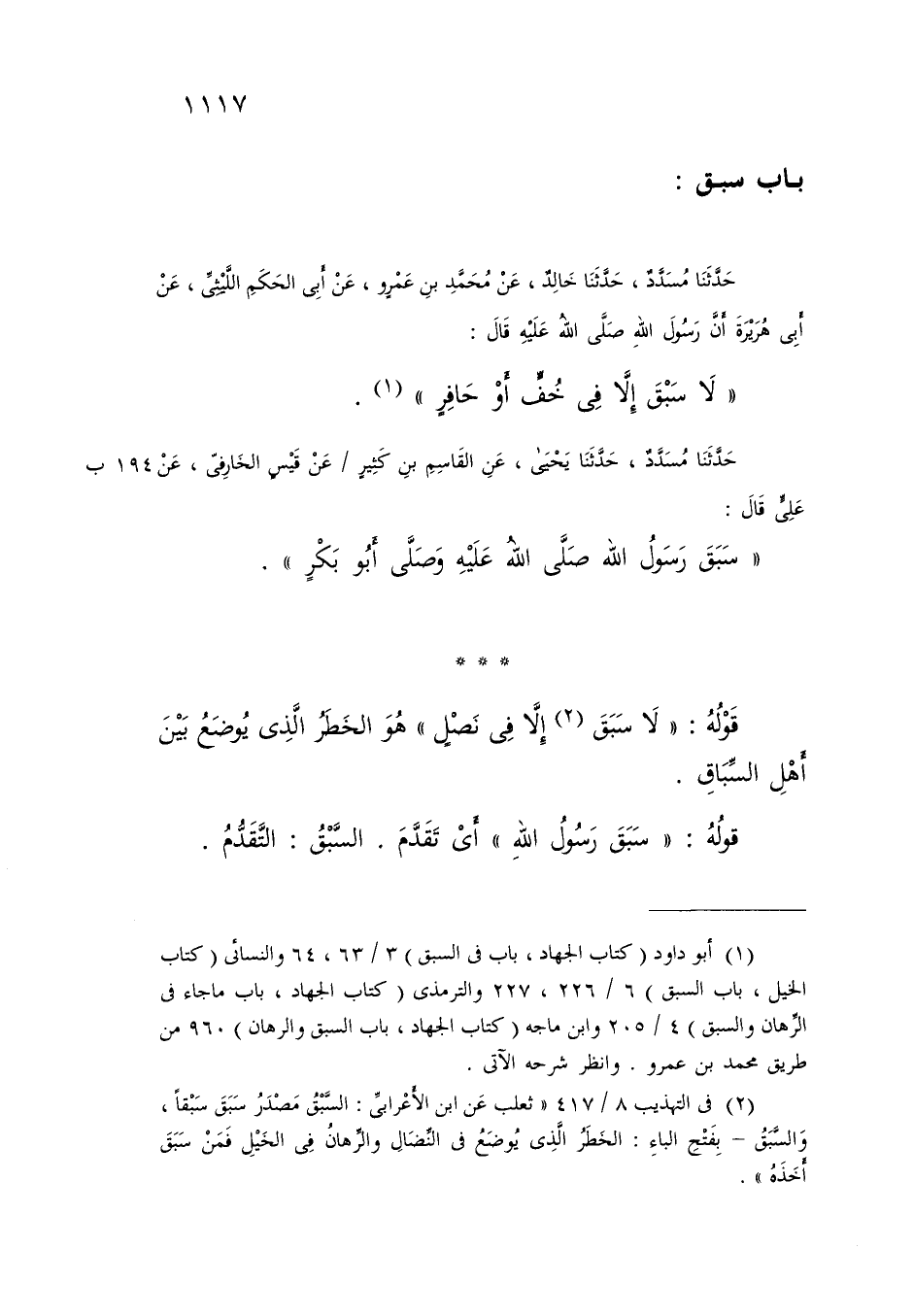 حَدَّثَنَا مُسَدَّدٌ، حَدَّثَنَا يَحْيَى، عَنِ الْقَاسِمِ بْنِ كَثِيرٍ، عَنْ قَيْسٍ الْخَارِقِيِّ، عَنْ عَلِيٍّ قَالَ: «§سَبَقَ رَسُولُ اللَّهِ صَلَّى اللَّهُ عَلَيْهِ وَصَلَّى أَبُو بَكْرٍ» قَوْلُهُ: «لَا سَبَقَ إِلَّا فِي نَصْلٍ» هُوَ الْخَطَرُ الَّذِي يُوضَعُ بَيْنَ أَهْلِ السِّبَاقِ قَوْلُهُ: «سَبَقَ رَسُولُ اللَّهِ» أَيْ: تَقَدَّمَ , السَّبْقُ: التَّقَدُّمُ -[1118]- وَسَمِعْتُ أَبَا نَصْرٍ يَقُولُ: السَّبَقُ: مَا سُبِّقَ عَلَيْهِ مِنْ جَارِيَةٍ أَوْ غُلَامٍ أَوْ فَرَسٍ وَأَنْشَدَنَا: