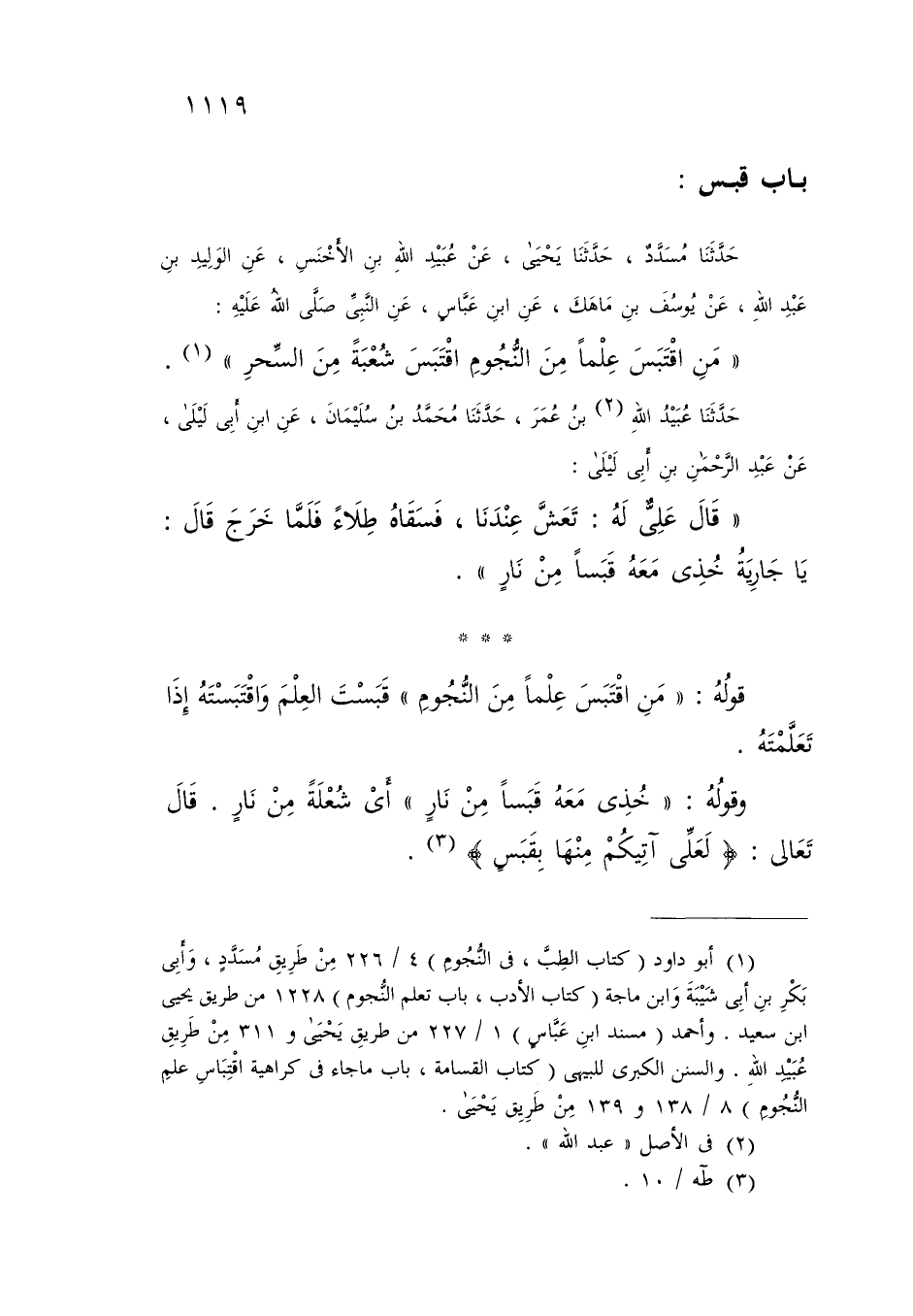 حَدَّثَنَا مُسَدَّدٌ، حَدَّثَنَا يَحْيَى، عَنْ عُبَيْدِ اللَّهِ بْنِ الْأَخْنَسِ، عَنِ الْوَلِيدِ بْنِ عَبْدِ اللَّهِ، عَنْ يُوسُفَ بْنِ مَاهَكَ، عَنِ ابْنِ عَبَّاسٍ، عَنِ النَّبِيِّ صَلَّى اللَّهُ عَلَيْهِ: «§مَنِ اقْتَبَسَ عِلْمًا مِنَ النُّجُومِ اقْتَبَسَ شُعْبَةً مِنَ السِّحْرِ»