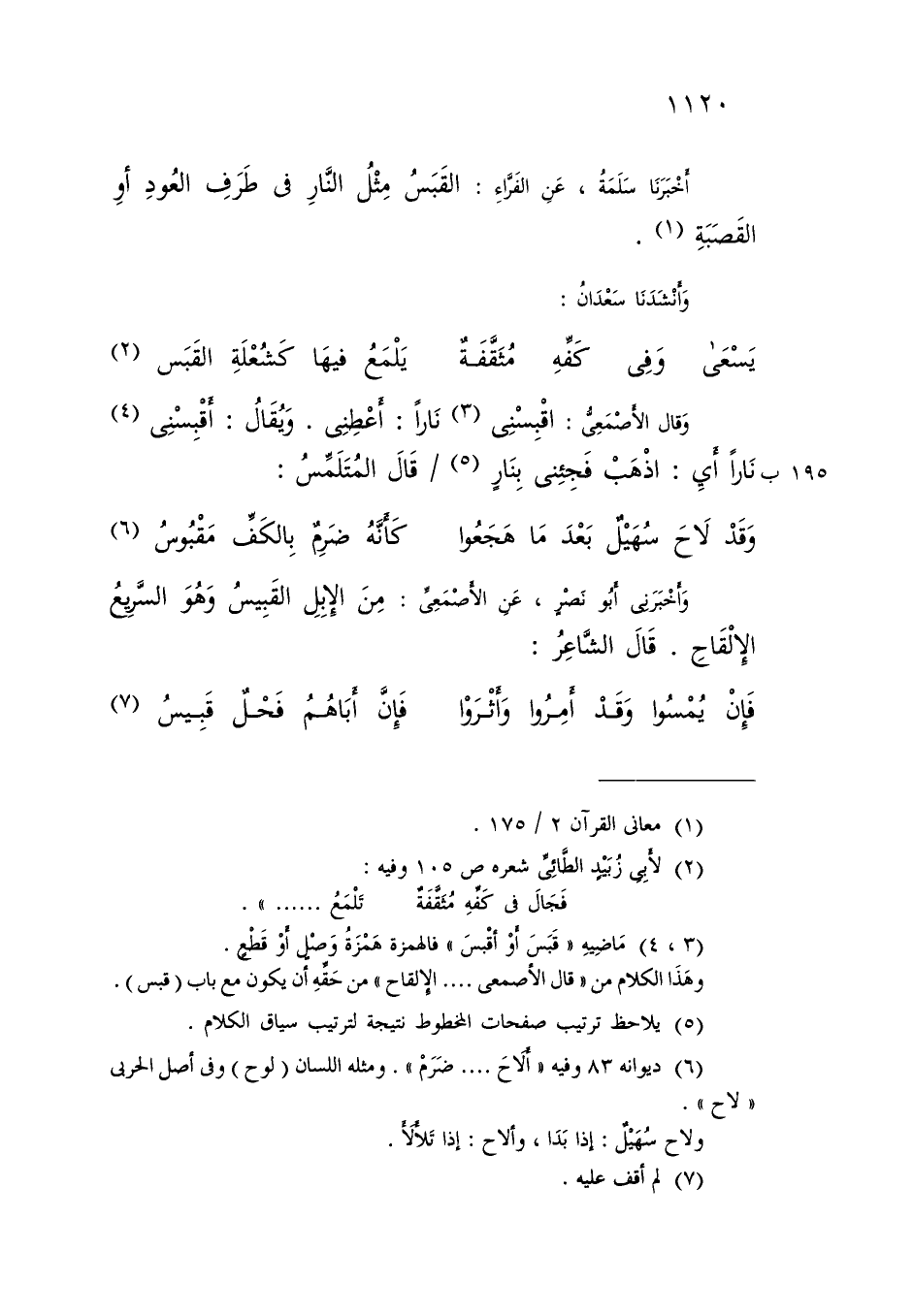 : 10] أَخْبَرَنَا سَلَمَةُ، عَنِ الْفَرَّاءِ: الْقَبَسُ مِثْلُ النَّارِ فِي طَرَفِ الْعُودِ أَوِ الْقَصَبَةِ وَأَنْشَدَنَا سَعْدَانُ: