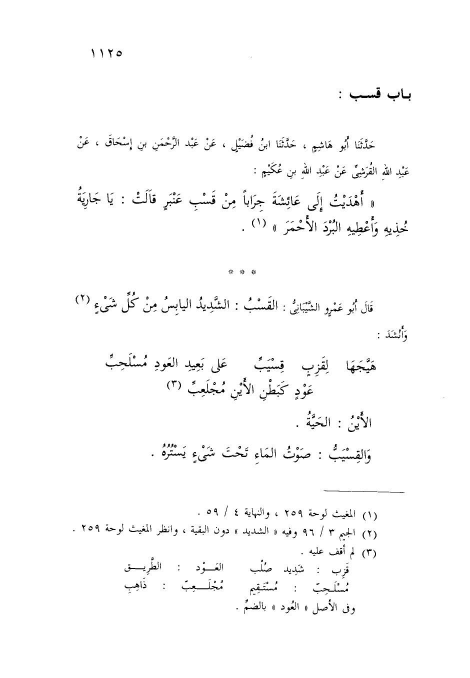 حَدَّثَنَا أَبُو هَاشِمٍ، حَدَّثَنَا ابْنُ فُضَيْلٍ، عَنْ عَبْدِ الرَّحْمَنِ بْنِ إِسْحَاقَ، عَنْ عَبْدِ اللَّهِ الْقُرَشِيِّ، عَنْ عُبَيْدِ اللَّهِ بْنِ عُكَيْمٍ: أَهْدَيْتُ إِلَى عَائِشَةَ جِرَابًا مِنْ قسْبِ عَنْبَرٍ، قَالَتْ: يَا جَارِيَةُ §خُذِيهِ وَأَعْطِيهِ الْبُرْدَ الْأَحْمَرَ " قَالَ أَبُو عَمْرٍو الشَّيْبَانِيُّ: الْقَسْبُ: الشَّدِيدُ الْيَابِسُ مِنْ كُلِّ شَيْءٍ، وَأَنْشَدَ: