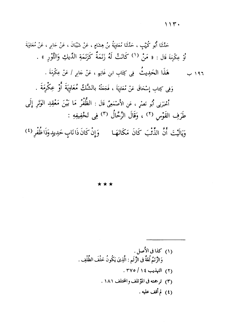 حَدَّثَنَا أَبُو كُرَيْبٍ، حَدَّثَنَا مُعَاوِيَةُ بْنُ هِشَامٍ، عَنْ شَيْبَانَ، عَنْ جَابِرٍ، عَنْ مُعَاوِيَةَ، أَوْ عِكْرِمَةَ قَالَ: «§مَنْ كَانَتْ لَهُ زَنَمَةٌ كَزَنَمَةِ الدِّيكِ وَالثَّوْرِ» هَذَا الْحَدِيثُ فِي كِتَابِ ابْنِ غَانِمٍ، عَنْ جَابِرٍ، عَنْ عِكْرِمَةَ، وَفِي كِتَابِ إِسْحَاقَ عَنْ مُعَاوِيَةَ، بِالشَّكِّ: مُعَاوِيَةَ أَوْ عِكْرِمَةَ أَخْبَرَنِي أَبُو نَصْرٍ، عَنِ الْأَصْمَعِيِّ قَالَ: الظُّفُرُ مَا بَيْنَ مَعْقِدِ الْوَتَرِ إِلَى طَرَفِ الْقَوْسِ وَقَالَ الرَّحَّالُ فِي تَخْفِيفِهِ: