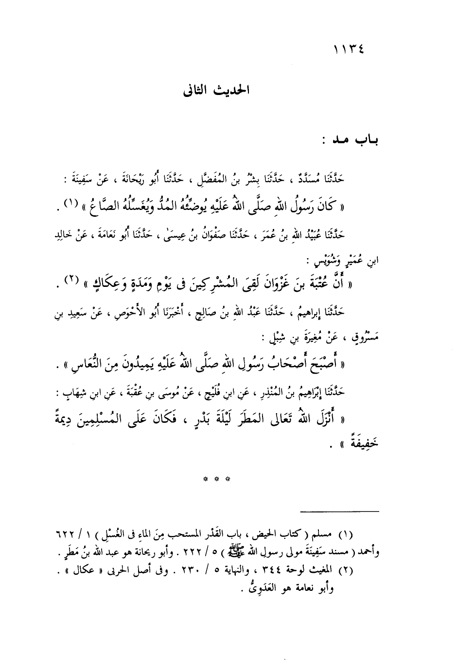 حَدَّثَنَا مُسَدَّدٌ، حَدَّثَنَا بِشْرُ بْنُ الْمُفَضَّلِ، حَدَّثَنَا أَبُو رَيْحَانَةَ، عَنْ سَفِينَةَ: كَانَ رَسُولُ اللَّهِ صَلَّى اللَّهُ عَلَيْهِ §يُوَضِّئُهُ الْمُدُّ، وَيُغَسِّلُهُ الصَّاعُ "