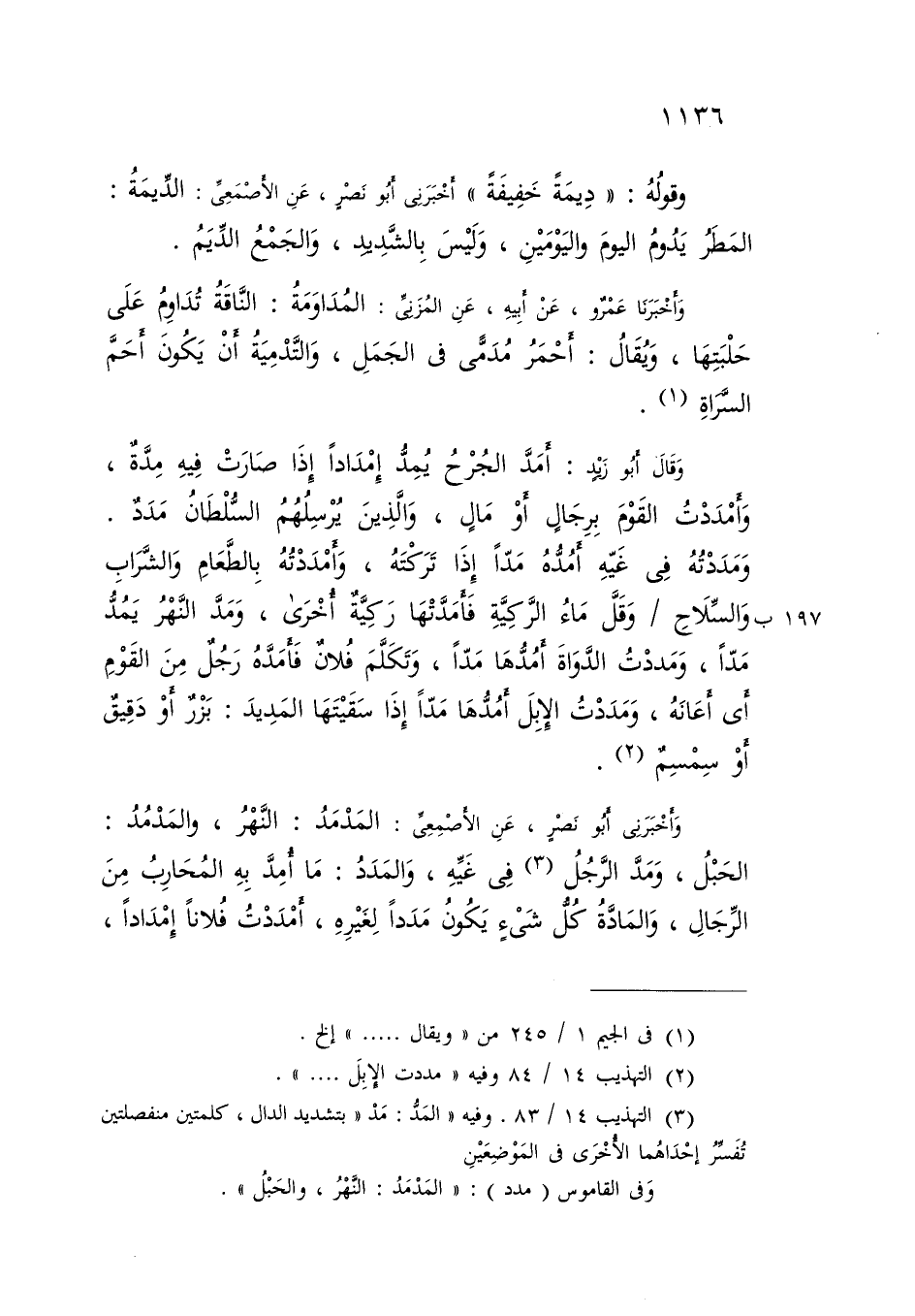 وَقَوْلُهُ: «دِيمَةً خَفِيفَةً» أَخْبَرَنِي أَبُو نَصْرٍ، عَنِ الْأَصْمَعِيِّ: الدِّيمَةُ: الْمَطَرُ يَدُومُ الْيَوْمَ وَالْيَوْمَيْنِ، وَلَيْسَ بِالشَّدِيدِ، وَالْجَمْعُ الدِّيَمُ وَأَخْبَرَنَا عَمْرٌو، عَنْ أَبِيهِ، عَنِ الْمُزَنِيِّ: الْمُدَاوَمَةُ: النَّاقَةُ تُدَاوِمُ عَلَى حَلْبَتِهَا، وَيُقَالُ: أَحْمَرُ مُدَمًّى فِي الْجَمَلِ، وَالتَّدْمِيَةُ: أَنْ يَكُونَ أَحَمَّ السَّرَاةِ وَقَالَ أَبُو زَيْدٍ: أَمَدَّ الْجُرْحُ يُمِدُّ إِمْدَادًا إِذَا صَارَتْ فِيهِ مِدَّةٌ، وَأَمْدَدْتُ الْقَوْمَ بِرِجَالٍ أَوْ مَالٍ، وَالَّذِينَ يُرْسِلُهُمُ السُّلْطَانُ مَدَدٌ وَمَدَدْتُهُ فِي غَيِّهِ أَمُدُّهُ مَدًّا إِذَا تَرَكْتُهُ، وَأَمْدَدْتُهُ بِالطَّعَامِ وَالشَّرَابِ وَالسِّلَاحِ، وَقَلَّ مَاءُ الرَّكِيَّةِ فَأَمَدَّتْهَا رَكِيَّةٌ أُخْرَى، وَمَدَّ النَّهْرُ يَمُدُّ مَدًّا، وَمَدَدْتُ الدَّوَاةَ أَمُدُّهَا مَدًّا، وَتَكَلَّمَ فُلَانٌ فَأَمَدَّهُ رَجُلٌ مِنَ الْقَوْمِ: أَيْ أَعَانَهُ، وَمَدَدْتُ الْإِبِلَ أَمُدُّهَا مَدًّا إِذَا سَقَيْتُهَا الْمَدِيدَ: بَزْرٌ أَوْ دَقِيقٌ أَوْ سِمْسِمٌ وَأَخْبَرَنِي أَبُو نَصْرٍ، عَنِ الْأَصْمَعِيِّ: الْمَدْمَدُ: النَّهْرُ، وَالْمَدْمُدُ: الْحَبْلُ، وَمَدَّ الرَّجُلُ فِي غَيِّهِ، وَالْمَدَدُ: مَا أُمِدَّ بِهِ الْمُحَارِبُ مِنَ الرِّجَالِ، وَالْمَادَّةُ كُلُّ شَيْءٍ يَكُونُ مَدَدًا لِغَيْرِهِ، أَمْدَدْتُ فُلَانًا إِمْدَادًا