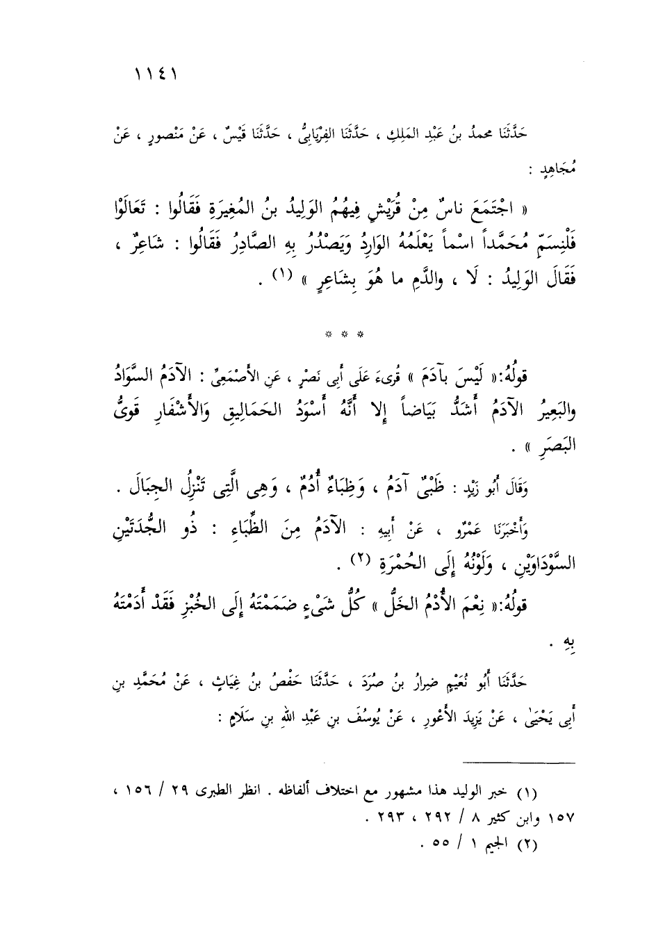 حَدَّثَنَا مُحَمَّدُ بْنُ عَبْدِ الْمَلِكِ، حَدَّثَنَا الْفِرْيَابِيُّ، حَدَّثَنَا قَيْسٌ، عَنْ مَنْصُورٍ، عَنْ مُجَاهِدٍ: " اجْتَمَعَ نَاسٌ مِنْ قُرَيْشٍ فِيهِمُ الْوَلِيدُ بْنُ الْمُغِيرَةِ، فَقَالُوا: تَعَالَوْا فَلْنُسَمِّ مُحَمَّدًا اسْمًا يَعْلَمُهُ الْوَارِدُ، وَيَصْدُرُ بِهِ الصَّادِرُ، فَقَالُوا: شَاعِرٌ، فَقَالَ الْوَلِيدُ: §لَا، وَالدَّمِ مَا هُوَ بِشَاعِرٍ " قَوْلُهُ: «لَيْسَ بِآدَمَ» قُرِئَ عَلَى أَبِي نَصْرٍ، عَنِ الْأَصْمَعِيِّ: الْآدَمُ السَّوَادُ، وَالْبَعِيرُ الْآدَمُ: أَشَدُّ بَيَاضًا إِلَّا أَنَّهُ أَسْوَدُ الْحَمَالِيقِ وَالْأَشْفَارِ، قَوِيُّ الْبَصَرِ وَقَالَ أَبُو زَيْدٍ: ظَبْيٌ آدَمُ، وَظِبَاءٌ أُدُمٌ، وَهِيَ الَّتِي تَنْزِلُ الْجِبَالَ وَأَخْبَرَنَا عَمْرٌو، عَنْ أَبِيهِ: الْآدَمُ مِنَ الظِّبَاءِ: ذُو الْجُدَّتَيْنِ السَّوْدَاوَيْنِ، وَلَوْنُهُ إِلَى الْحُمْرَةِ قَوْلُهُ: «نِعْمَ الْأُدْمُ الْخَلُّ» كُلُّ شَيْءٍ ضَمَمْتَهُ إِلَى الْخُبْزِ فَقَدْ أَدَمْتَهُ بِهِ