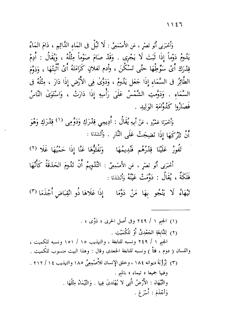 وَأَخْبَرَنِي أَبُو نَصْرٍ، عَنِ الْأَصْمَعِيِّ: لَا تَبُلْ فِي الْمَاءِ الدَّائِمِ، دَامَ الْمَاءُ يَدُومُ دَوْمًا: إِذَا ثَبَتَ لَا يَجْرِي وَقَدْ صَامَ صَوْمًا مِثْلُهُ، وَيُقَالُ: أَدِمْ قِدْرَكَ: أَيْ سَوِّطْهَا حَتَّى تَسْكُنَ، وَأَدِمْ لِفُلَانٍ كَرَامَتَهُ: أَيْ أَثْبِتْهَا، وَدَوَّمَ الطَّائِرُ فِي السَّمَاءِ: إِذَا جَعَلَ يَدُومُ، وَدَوَّى فِي الْأَرْضِ: إِذَا دَارَ، مِثْلُهُ فِي السَّمَاءِ وَدَوَّمَتِ الشَّمْسُ عَلَى رَأْسِهِ: إِذَا دَارَتْ، وَاسْتَوَى النَّاسُ فَصَارُوا كَدُوَّامَةِ الْوَلِيدِ وَأَخْبَرَنَا عَمْرٌو، عَنْ أَبِيهِ، يُقَالُ: أَدِيمِي قِدْرَكِ وَدَوِّمِي قِدْرَكِ: وَهُوَ أَنْ تَتْرُكَهَا إِذَا نَضِجَتْ عَلَى النَّارِ وَأَنْشَدَنَا: