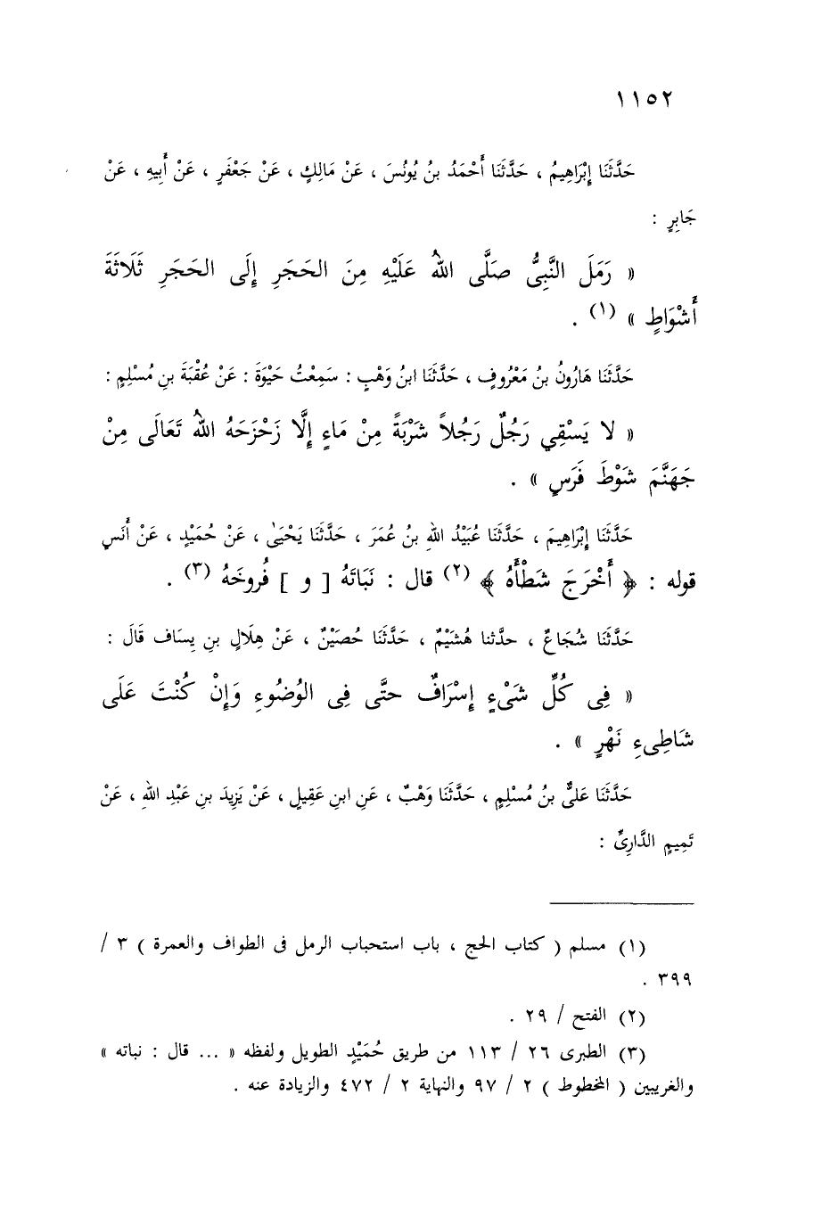 حَدَّثَنَا إِبْرَاهِيمُ، حَدَّثَنَا أَحْمَدُ بْنُ يُونُسَ، عَنْ مَالِكٍ، عَنْ جَعْفَرٍ، عَنْ أَبِيهِ، عَنْ جَابِرٍ: «§رَمَلَ النَّبِيُّ صَلَّى اللَّهُ عَلَيْهِ مِنَ الْحَجَرِ إِلَى الْحَجَرِ ثَلَاثَةَ أَشْوَاطٍ»