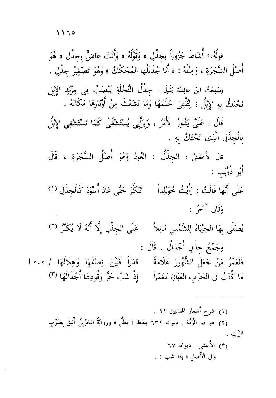قَوْلُهُ: «أَشَاطَ جَزُورًا بِجِذْلٍ» وَقَوْلُهُ: «وَأَنْتَ عَاضٌّ بِجِذْلٍ» هُوَ أَصْلُ الشَّجَرَةِ، وَمِثْلُهُ: «أَنَا جُذَيْلُهَا الْمُحَكَّكُ» وَهُوَ تَصْغُيرُ جِذْلٍ وَسَمِعْتُ ابْنَ عَائِشَةَ يَقُولُ: جِذْلُ النَّخْلَةِ: يُنْصَبُ فِي مِرْبَدِ الْإِبِلِ تَحْتَكُّ بِهِ الْإِبِلُ، لَتُلْقِي حَلَمَهَا وَمَا تَشَعَّثَ مِنْ أَوْبَارِهَا مَكَانَهُ قَالَ: عَلَيَّ يَدُورُ الْأَمْرُ، وَبِرَأْيِي يُسْتَشْفَى كَمَا تَسْتَشْفِي الْإِبِلُ بِالْجِذْلِ الَّذِي تَحْتَكُّ بِهِ قَالَ الْأَخْفَشُ: الْجِذْلُ: الْعُودُ، وَهُوَ أَصْلُ الشَّجَرَةِ قَالَ أَبُو ذُؤَيْبٍ:
