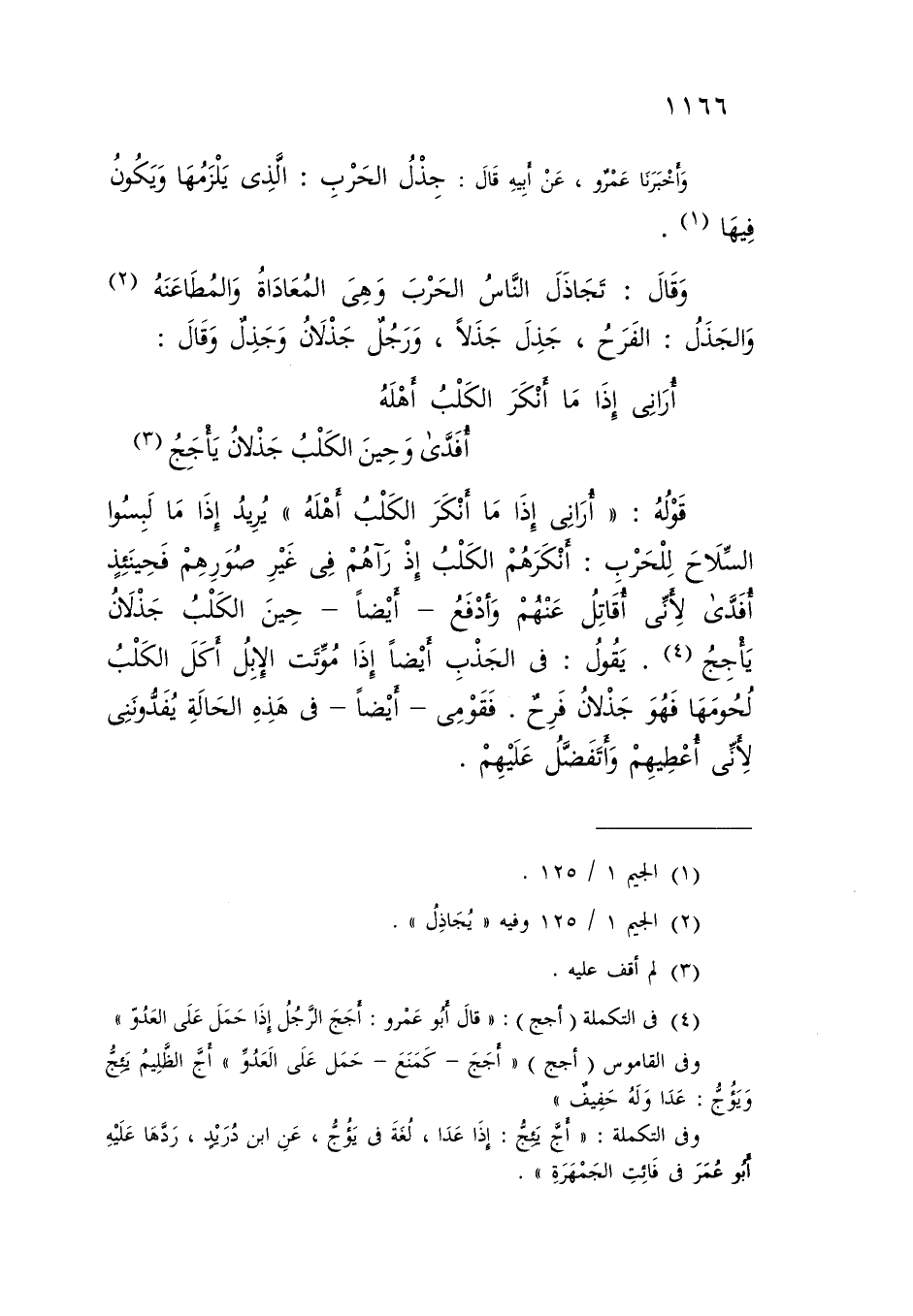 قَوْلُهُ: «أُرَانِي إِذَا مَا أَنْكَرَ الْكَلْبُ أَهْلَهُ» يُرِيدُ إِذَا مَا لَبِسُوا السِّلَاحَ لِلْحَرْبِ: أَنْكَرَهُمُ الْكَلْبُ إِذَا رَآهُمْ فِي غَيْرِ صُوَرِهِمْ، فَحِينَئِذٍ أُفَدَّى لِأَنِّي أُقَاتِلُ عَنْهُمْ وَأَدْفَعُ - أَيْضًا - حِينَ الْكَلْبُ جَذْلَانُ يَأْجِجُ يَقُولُ: فِي الْجذْبِ أَيْضًا إِذَا مُوِّتَتِ الْإِبِلُ أَكَلَ الْكَلْبُ لُحُومَهَا فَهُوَ جَذْلَانُ فَرِحٌ فَقَوْمِي - أَيْضًا - فِي هَذِهِ الْحَالَةِ يُفَدُّونَنِي لِأَنِّي أُعْطِيهِمْ وَأَتَفَضَّلُ عَلَيْهِمْ -[1167]- وَالْجَذْلُ: الِانْتِصَابُ: جَذَلَ يَجْذُلُ جُذُولًا وَأَنْشَدَنَا أَبُو نَصْرٍ: