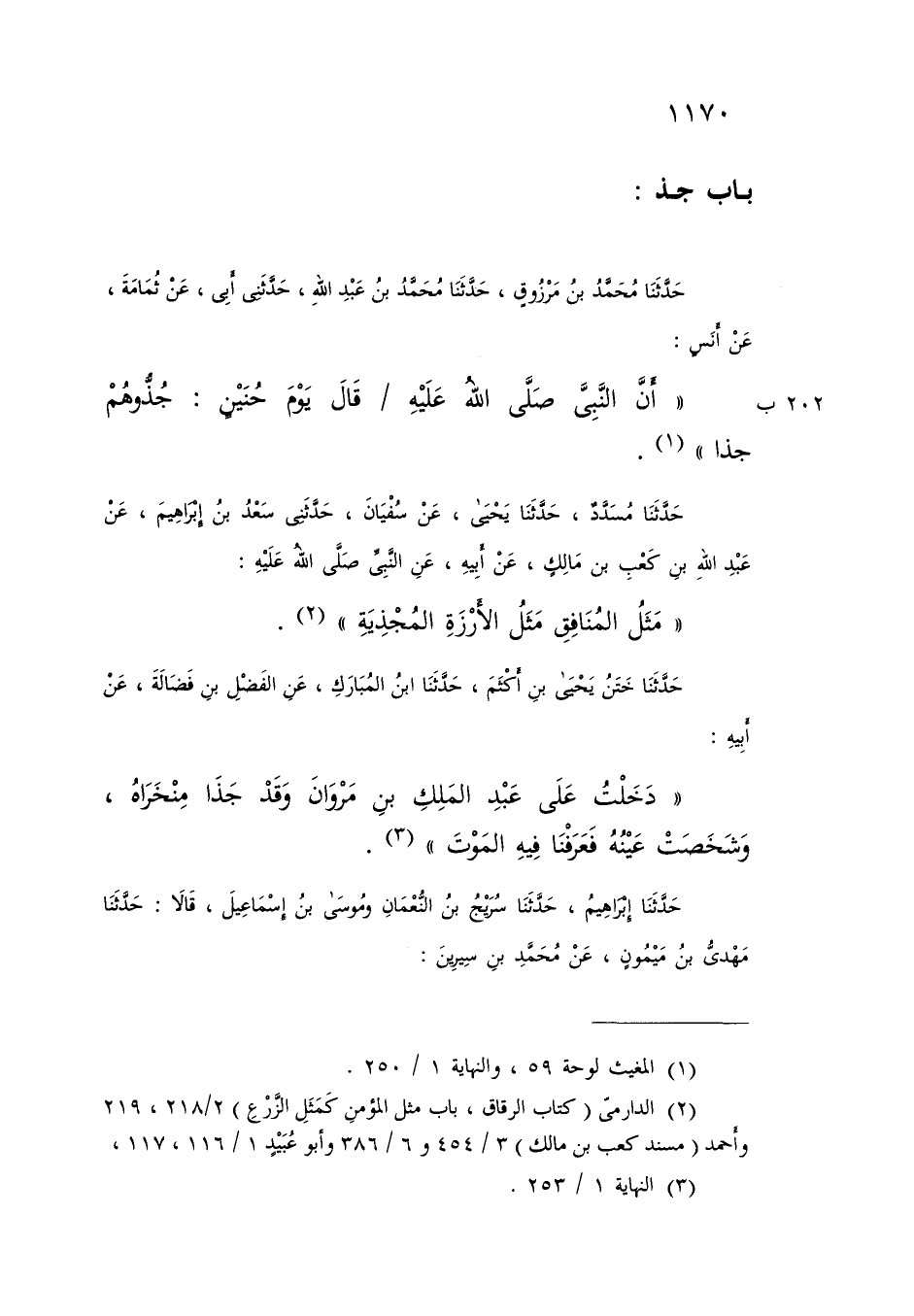 حَدَّثَنَا خَتَنُ يَحْيَى بْنِ أَكْثَمَ، حَدَّثَنَا ابْنُ الْمُبَارَكِ، عَنِ الْفَضْلِ بْنِ فَضَالَةَ، عَنْ أَبِيهِ: «دَخَلْتُ عَلَى عَبْدِ الْمَلِكِ بْنِ مَرْوَانَ وَقَدْ §جَذَا مَنْخِرَاهُ، وَشَخَصَتْ عَيْنُهُ، فَعَرَفْنَا فِيهِ الْمَوْتَ»