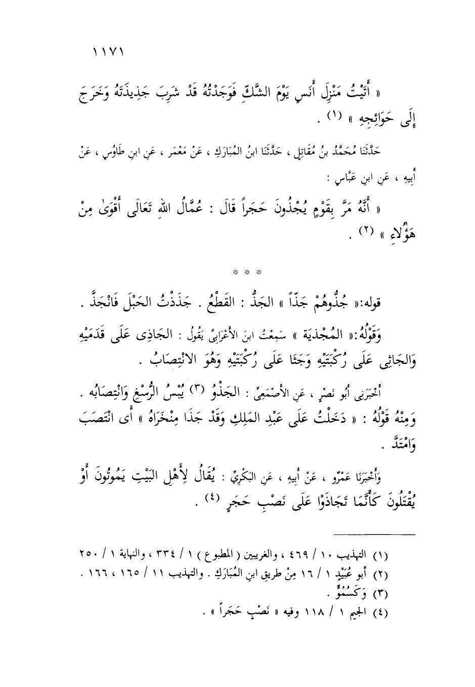 حَدَّثَنَا مُحَمَّدُ بْنُ مُقَاتِلٍ، حَدَّثَنَا ابْنُ الْمُبَارَكِ، عَنْ مَعْمَرٍ، عَنِ ابْنِ طَاوُسٍ، عَنْ أَبِيهِ، عَنِ ابْنِ عَبَّاسٍ: " أَنَّهُ مَرَّ بِقَوْمٍ يُجْذُونَ حَجَرًا قَالَ: §عُمَّالُ اللَّهِ تَعَالَى أَقْوَى مِنْ هَؤُلَاءِ " قَوْلُهُ: «جُذُّوهُمْ جَذًّا» الْجَذُّ: الْقَطْعُ جَذَذْتُ الْحَبْلَ فَانْجَذَّ وَقَوْلُهُ: «الْمُجْذِيَةُ» سَمِعْتُ ابْنَ الْأَعْرَابِيِّ يَقُولُ: الْجَاذِي عَلَى قَدَمَيْهِ، وَالْجَاثِي عَلَى رُكْبَتَيْهِ، وَجَثَا عَلَى رُكْبَتِهِ وَهُوَ الِانْتِصَابُ. أَخْبَرَنِي أَبُو نَصْرٍ، عَنِ الْأَصْمَعِيِّ: الْجَذْوُ يُبْسُ الرُّسْغِ وَانْتِصَابُهُ وَمِنْهُ قَوْلُهُ: «دَخَلْتُ عَلَى عَبْدِ الْمَلِكِ وَقَدْ جَذَا مِنْخَرَاهُ» أَيِ انْتَصَبَ وَامْتَدَّ وَأَخْبَرَنَا عَمْرٌو، عَنْ أَبِيهِ، عَنِ الْبَكْرِيِّ: يُقَالَ لِأَهْلِ الْبَيْتِ يَمُوتُونَ أَوْ يُقْتَلُونَ كَأَنَّمَا تَجَاذَوْا عَلَى نَصْبِ حَجَرٍ -[1172]-. وَقَالَ الْكِلَابِيُّ: تَجَذَّيْتُ يَوْمِي أَجْمَعَ، أَيْ دَأَبْتُ، وَتَجَذَّتِ الْمَرْأَةُ عَلَى النَّسْجِ يَوْمَهَا أَجْمَعَ. وَقَالَ الْبَكْرِيُّ: التَّجَاذِي أَنْ يَتَجَاذَى الْقَوْمُ لِلرُّكَبِ لِلْخُصُومَةِ وَقَوْلُهُ: «وَقَدْ شَرِبَ جَذِيذَتَهُ» يُرِيدُ السَّوِيقَ أَخْبَرَنِي أَبُو نَصْرٍ، عَنِ الْأَصْمَعِيِّ: إِذَا سَمِنَ سَنَامُ وَلَدِ النَّاقَةِ قِيلَ: قَدْ أَجْذَى وَهُوَ مُجْذٍ إِجْذَاءً وَإِجْذَاؤُهُ: ارْتِفَاعُهُ، وَأَجْذَى الصَّبِيَّ أَبُوهُ عَلَى يَدِهِ: إِذَا حَمَلَهُ وَقَوْلُهُ: «يُجْذُونَ حَجَرًا» أَيْ يَرْفَعُونَ لِيَعْلَمُوا أَيُّهُمْ أَقْوَى وَقَوْلُهُ تَعَالَى: {أَوْ جَذْوَةٍ مِنَ النَّارِ} [القصص: 29] أَخْبَرَنِي أَبُو عُمَرَ، عَنِ الْكِسَائِيِّ، يُقَالُ: جِذْوَةٌ، وَجُذْوَةٌ، وَجَذْوَةٌ. أَخْبَرَنَا سَلَمَةُ، عَنِ الْفَرَّاءِ: جِذْوَةٌ وَجُذْوَةٌ -[1173]-. وَأَخْبَرَنَا الْأَثْرَمُ، عَنْ أَبِي عُبَيْدَةَ: جِذْوَةٌ: قِطْعَةٌ غَلِيظَةٌ مِنَ الْحَطَبِ مِثْلُ الْجِذْمَةِ مِنْ أَصْلِ الشَّجَرِ قَالَ الطِّرِمَّاحُ: