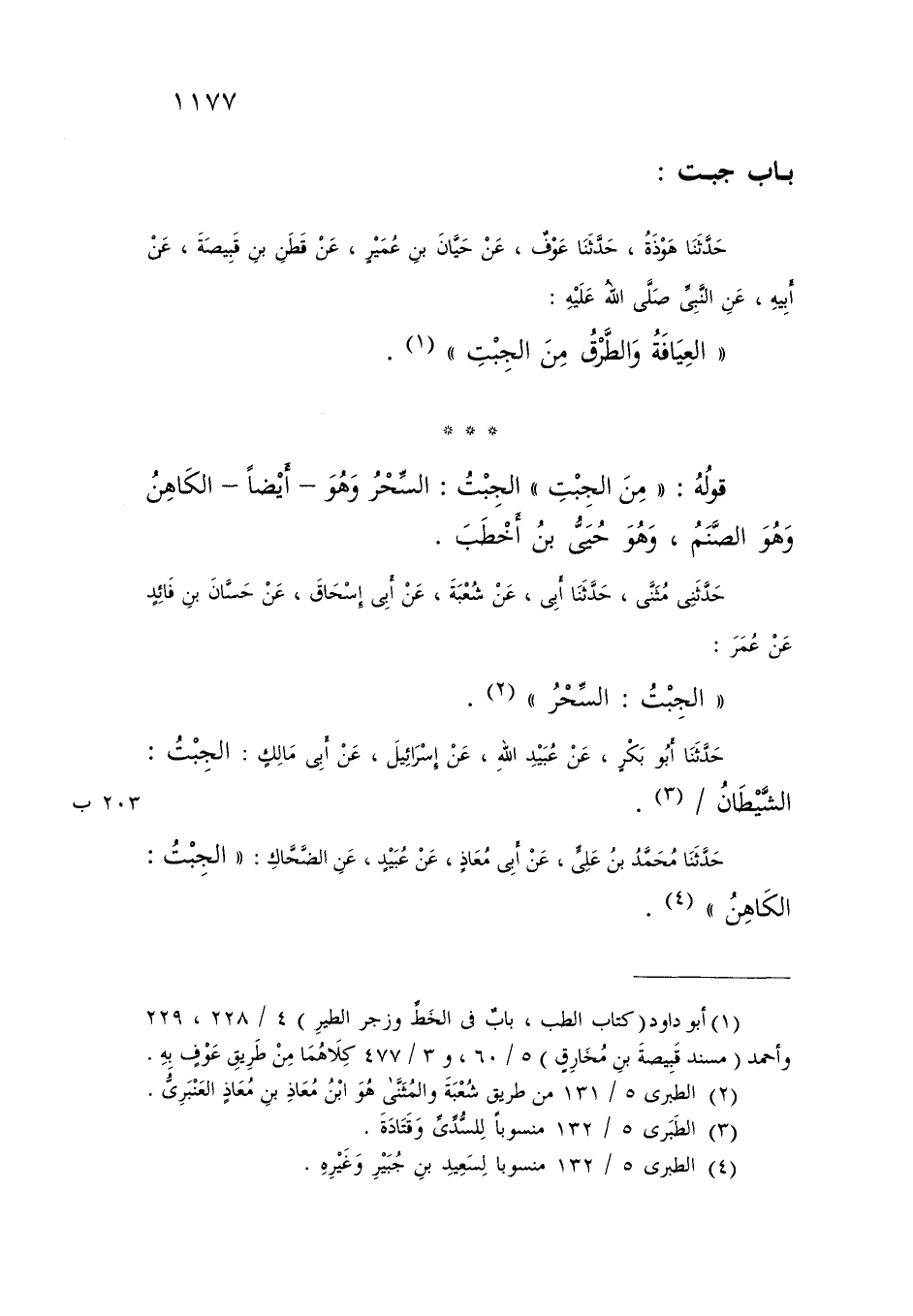 حَدَّثَنَا هَوْذَةُ، حَدَّثَنَا عَوْفٌ، عَنْ حَيَّانَ بْنِ عُمَيْرٍ، عَنْ قَطَنِ بْنِ قَبِيصَةَ، عَنْ أَبِيهِ، عَنِ النَّبِيِّ صَلَّى اللَّهُ عَلَيْهِ: «§الْعِيَافَةُ وَالطَّرْقُ مِنَ الْجِبْتِ» قَوْلُهُ: «مِنَ الْجِبْتِ» الْجِبْتُ: السِّحْرُ، وَهُوَ - أَيْضًا - الْكَاهِنُ، وَهُوَ الصَّنَمُ، وَهُوَ حُيَيُّ بْنُ أَخْطَبَ