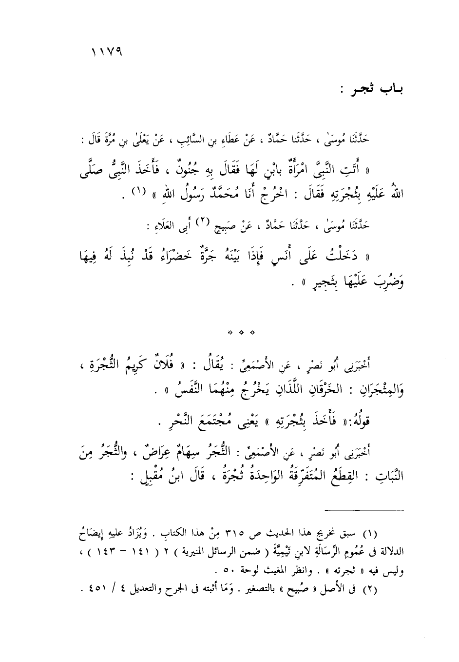 حَدَّثَنَا مُوسَى، حَدَّثَنَا حَمَّادٌ، عَنْ صُبَيْحٍ أَبِي الْعَلَاءِ: «دَخَلْتُ عَلَى أَنَسٍ فَإِذَا بَيْنَهُ جَرَّةٌ خَضْرَاءُ قَدْ نُبِذَ لَهُ فِيهَا، §وَضُرِبَ عَلَيْهَا بِثَجِيرٍ» أَخْبَرَنِي أَبُو نَصْرٍ، عَنِ الْأَصْمَعِيِّ: يُقَالُ: فُلَانٌ كَرِيمُ الثُّجْرَةِ، وَالْمِثْجَرَانِ: الْخَرْقَانِ اللَّذَانِ يَخْرُجُ مِنْهُمَا النَّفَسُ قَوْلُهُ: «فَأَخَذَ بِثُجْرَتِهِ» يَعْنِي مُجْتَمَعِ النَّحْرِ أَخْبَرَنِي أَبُو نَصْرٍ، عَنِ الْأَصْمَعِيِّ: الثُّجَرُ سِهَامٌ عِرَاضٌ، وَالثُّجَرُ مِنَ النَّبَاتِ: الْقِطَعُ الْمُتَفَرِّقَةُ، الْوَاحِدَةُ ثُجْرَةٌ قَالَ ابْنُ مُقْبِلٍ: