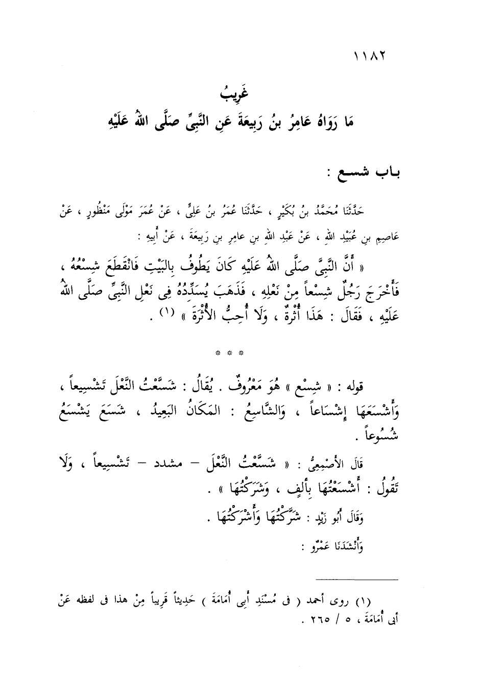 حَدَّثَنَا مُحَمَّدُ بْنُ بُكَيْرٍ، حَدَّثَنَا عُمَرُ بْنُ عَلِيٍّ، عَنْ عُمَرَ، مَوْلَى مَنْظُورٍ، عَنْ عَاصِمِ بْنِ عُبَيْدِ اللَّهِ، عَنْ عَبْدِ اللَّهِ بْنِ عَامِرِ بْنِ رَبِيعَةَ، عَنْ أَبِيهِ: إِنَّ النَّبِيَّ صَلَّى اللَّهُ عَلَيْهِ كَانَ يَطُوفُ بِالْبَيْتِ فَانْقَطَعَ شِسْعُهُ، فَأَخْرَجَ رَجُلٌ شِسْعًا مِنْ نَعْلِهِ، فَذَهَبَ يُسَدِّدُهُ فِي نَعْلِ النَّبِيِّ صَلَّى اللَّهُ عَلَيْهِ، فَقَالَ: «§هَذَا أَثَرَةٌ، وَلَا أُحِبُّ الْأَثَرَةَ» قَوْلُهُ: «شِسْعٌ» : هُوَ مَعْرُوفٌ يُقَالُ: شَسَّعْتُ النَّعْلَ تَشْسِيعًا، وَأَشْسَعَهَا إِشْسَاعًا، وَالشَّاسِعُ: الْمَكَانُ الْبَعِيدُ، شَسَعَ يَشْسَعُ شُسُوعًا قَالَ الْأَصْمَعِيُّ: شَسَّعْتُ النَّعْلَ - مُشَدَّدٌ - تَشْسِيعًا، وَلَا تَقُولُ: أَشْسَعْتُهَا بِأَلْفٍ، وَشَرَكْتُهَا وَقَالَ أَبُو زَيْدٍ: شَرَّكْتُهَا وَأَشْرَكْتُهَا وَأَنْشَدَنَا عَمْرٌو: